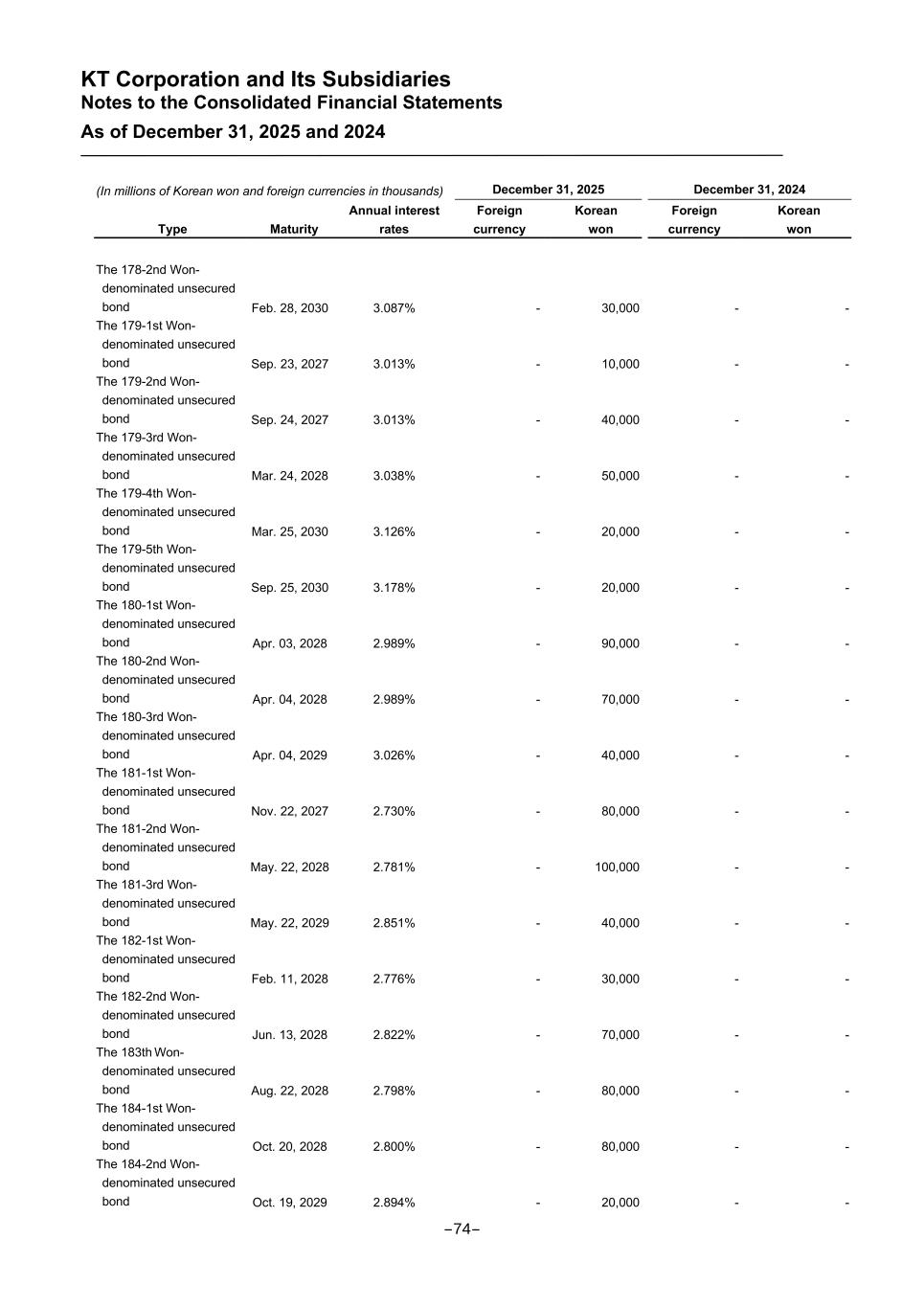 KT Corporation and Its Subsidiaries Notes to the Consolidated Financial Statements As of December 31, 2025 and 2024 (In millions of Korean won and foreign currencies in thousands) December 31, 2025 December 31, 2024 Type Maturity Annual interest rates Foreign currency Korean won Foreign currency Korean won The 178-2nd Won- denominated unsecured bond Feb. 28, 2030 3.087% - 30,000 - - The 179-1st Won- denominated unsecured bond Sep. 23, 2027 3.013% - 10,000 - - The 179-2nd Won- denominated unsecured bond Sep. 24, 2027 3.013% - 40,000 - - The 179-3rd Won- denominated unsecured bond Mar. 24, 2028 3.038% - 50,000 - - The 179-4th Won- denominated unsecured bond Mar. 25, 2030 3.126% - 20,000 - - The 179-5th Won- denominated unsecured bond Sep. 25, 2030 3.178% - 20,000 - - The 180-1st Won- denominated unsecured bond Apr. 03, 2028 2.989% - 90,000 - - The 180-2nd Won- denominated unsecured bond Apr. 04, 2028 2.989% - 70,000 - - The 180-3rd Won- denominated unsecured bond Apr. 04, 2029 3.026% - 40,000 - - The 181-1st Won- denominated unsecured bond Nov. 22, 2027 2.730% - 80,000 - - The 181-2nd Won- denominated unsecured bond May. 22, 2028 2.781% - 100,000 - - The 181-3rd Won- denominated unsecured bond May. 22, 2029 2.851% - 40,000 - - The 182-1st Won- denominated unsecured bond Feb. 11, 2028 2.776% - 30,000 - - The 182-2nd Won- denominated unsecured bond Jun. 13, 2028 2.822% - 70,000 - - The 183th Won- denominated unsecured bond Aug. 22, 2028 2.798% - 80,000 - - The 184-1st Won- denominated unsecured bond Oct. 20, 2028 2.800% - 80,000 - - The 184-2nd Won- denominated unsecured bond Oct. 19, 2029 2.894% - 20,000 - - -74-