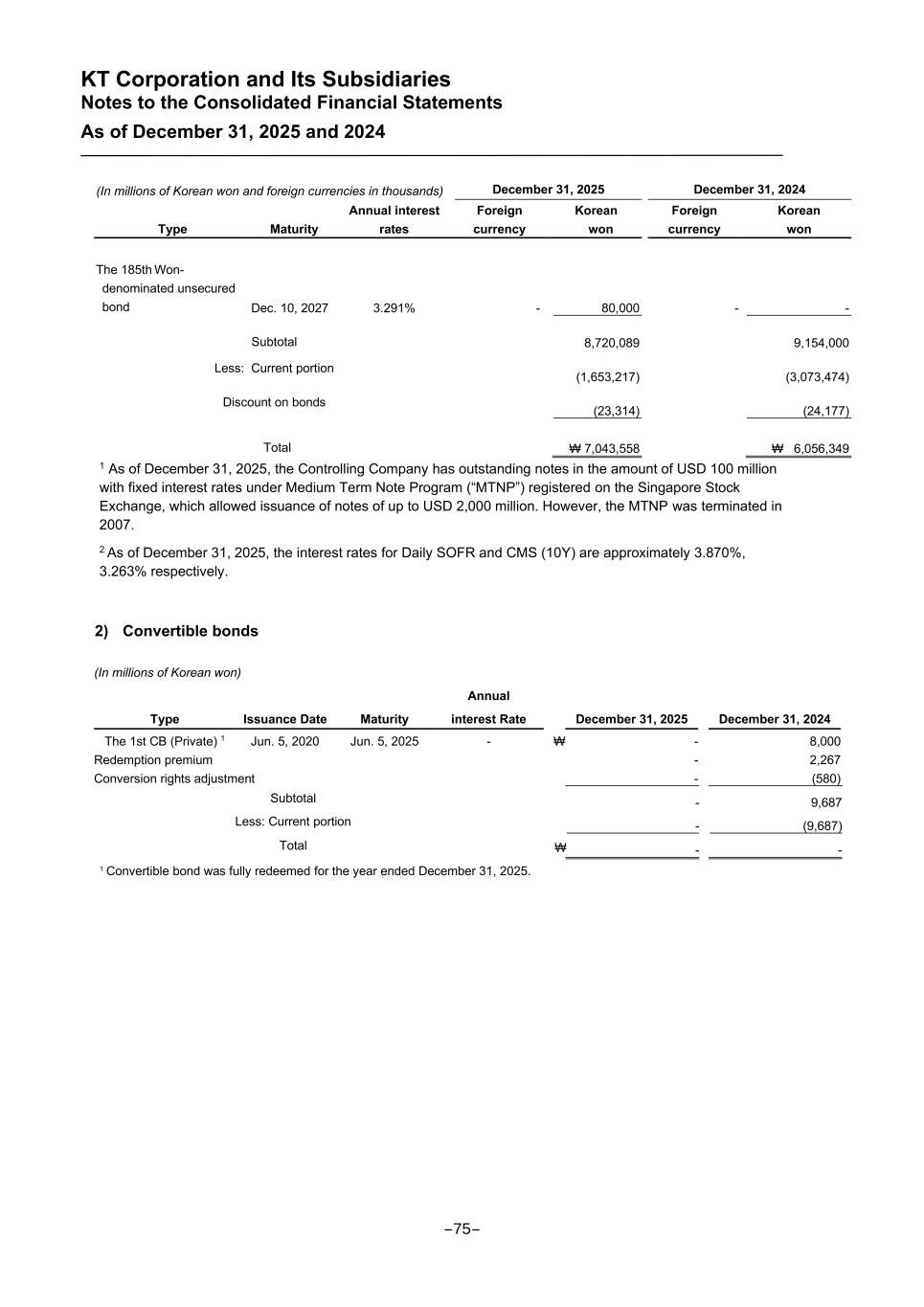 KT Corporation and Its Subsidiaries Notes to the Consolidated Financial Statements As of December 31, 2025 and 2024 (In millions of Korean won and foreign currencies in thousands) December 31, 2025 December 31, 2024 Type Maturity Annual interest rates Foreign currency Korean won Foreign currency Korean won The 185th Won- denominated unsecured bond Dec. 10, 2027 3.291% - 80,000 - - Subtotal 8,720,089 9,154,000 Less: Current portion (1,653,217) (3,073,474) Discount on bonds (23,314) (24,177) Total ₩ 7,043,558 ₩ 6,056,349 1 As of December 31, 2025, the Controlling Company has outstanding notes in the amount of USD 100 million with fixed interest rates under Medium Term Note Program (“MTNP”) registered on the Singapore Stock Exchange, which allowed issuance of notes of up to USD 2,000 million. However, the MTNP was terminated in 2007. 2 As of December 31, 2025, the interest rates for Daily SOFR and CMS (10Y) are approximately 3.870%, 3.263% respectively. 2) Convertible bonds (In millions of Korean won) Type Issuance Date Maturity Annual interest Rate December 31, 2025 December 31, 2024 The 1st CB (Private) 1 Jun. 5, 2020 Jun. 5, 2025 - ₩ - 8,000 Redemption premium - 2,267 Conversion rights adjustment - (580) Subtotal - 9,687 Less: Current portion - (9,687) Total ₩ - - 1 Convertible bond was fully redeemed for the year ended December 31, 2025. -75-