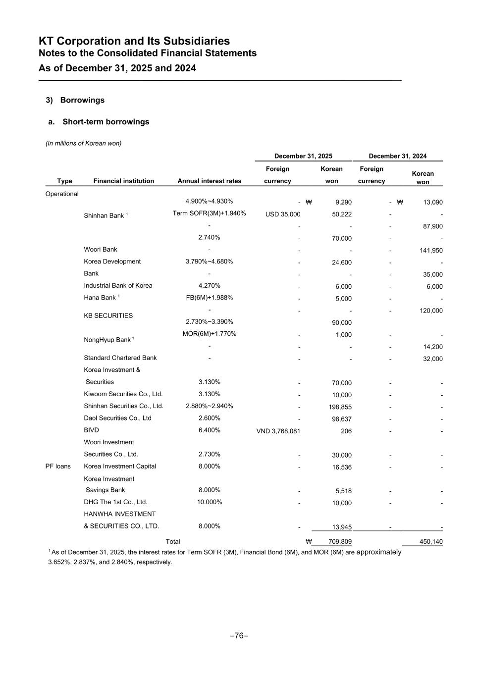 KT Corporation and Its Subsidiaries Notes to the Consolidated Financial Statements As of December 31, 2025 and 2024 3) Borrowings a. Short-term borrowings (In millions of Korean won) December 31, 2025 December 31, 2024 Type Financial institution Annual interest rates Foreign currency Korean won Foreign currency Korean won Operational Shinhan Bank 1 4.900%~4.930% - ₩ 9,290 - ₩ 13,090 Term SOFR(3M)+1.940% USD 35,000 50,222 - - - - - - 87,900 2.740% - 70,000 - - Woori Bank - - - - 141,950 Korea Development Bank 3.790%~4.680% - 24,600 - - - - - - 35,000 Industrial Bank of Korea 4.270% - 6,000 - 6,000 Hana Bank 1 FB(6M)+1.988% - 5,000 - - KB SECURITIES - - - - 120,000 2.730%~3.390% 90,000 NongHyup Bank 1 MOR(6M)+1.770% - 1,000 - - - - - - 14,200 Standard Chartered Bank - - - - 32,000 Korea Investment & Securities 3.130% - 70,000 - - Kiwoom Securities Co., Ltd. 3.130% - 10,000 - - Shinhan Securities Co., Ltd. 2.880%~2.940% - 198,855 - - Daol Securities Co., Ltd 2.600% - 98,637 - - BIVD 6.400% VND 3,768,081 206 - - Woori Investment Securities Co., Ltd. 2.730% - 30,000 - - PF loans Korea Investment Capital 8.000% - 16,536 - - Korea Investment Savings Bank 8.000% - 5,518 - - DHG The 1st Co., Ltd. 10.000% - 10,000 - - HANWHA INVESTMENT & SECURITIES CO., LTD. 8.000% - 13,945 - - Total ₩ 709,809 450,140 1 As of December 31, 2025, the interest rates for Term SOFR (3M), Financial Bond (6M), and MOR (6M) are approximately 3.652%, 2.837%, and 2.840%, respectively. -76-