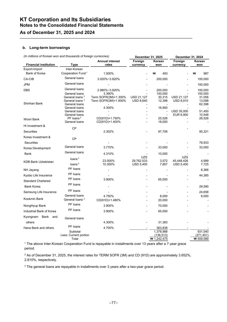 KT Corporation and Its Subsidiaries Notes to the Consolidated Financial Statements As of December 31, 2025 and 2024 b. Long-term borrowings (In millions of Korean won and thousands of foreign currencies) December 31, 2025 December 31, 2024 Financial institution Type Annual interest rates Foreign currency Korean won Foreign currency Korean won Export-Import Bank of Korea Inter-Korean Cooperation Fund 1 1.000% - ₩ 493 - ₩ 987 CA-CIB General loans 3.020%~3.820% - 200,000 - 100,000 JPM General loans - - - - 100,000 DBS General loans 2.980%~3.820% - 200,000 - 100,000 Shinhan Bank General loans 3.390% - 100,000 - 100,000 General loans 2 Term SOFR(3M)+1.300% USD 21,127 30,315 USD 21,127 31,056 General loans 2 Term SOFR(3M)+1.600% USD 8,640 12,398 USD 8,910 13,098 General loans - - - - 62,398 General loans 4.300% - 16,900 - - General loans - - - USD 35,000 51,450 Woori Bank General loans - - - EUR 6,900 10,548 PF loans 2 CD(91D)+1.750% - 25,526 - 26,526 General loans CD(91D)+1.400% - 18,000 - - Hi Investment & Securities CP 2.302% - 97,706 - 95,321 Korea Investment & Securities CP - - - - 78,933 Korea Development Bank General loans 3.770% - 33,000 - 33,000 General loans 4.310% - 10,000 - - KDB Bank Uzbekistan loans 3 23.000% UZS 29,762,533 3,572 UZS 45,448,426 4,999 loans 3 10.300% USD 5,400 7,857 USD 5,400 7,725 NH Jayang PF loans - - - - 8,366 Kyobo Life Insurance PF loans - - - - 44,385 Standard Chartered Bank Korea PF loans 3.900% - 65,000 - - PF loans - - - - 29,590 Samsung Life Insurance PF loans - - - - 24,658 Kookmin Bank General loans 4.750% - 8,000 - 8,000 General loans 2 CD(91D)+1.480% - 20,000 - - NongHyup Bank PF loans 3.900% - 70,000 - - Industrial Bank of Korea PF loans 3.900% - 65,000 - - Kyongnam Bank and others General loans 4.300% - 31,383 - - Hana Bank and others PF loans 4.700% - 363,838 - - Subtotal 1,378,988 931,040 Less: Current portion (136,513) (371,451) Total ₩ 1,242,475 ₩ 559,589 1 The above Inter-Korean Cooperation Fund is repayable in installments over 13 years after a 7-year grace period. 2 As of December 31, 2025, the interest rates for TERM SOFR (3M) and CD (91D) are approximately 3.652%, 2.810%, respectively. 3 The general loans are repayable in installments over 3 years after a two-year grace period. -77-