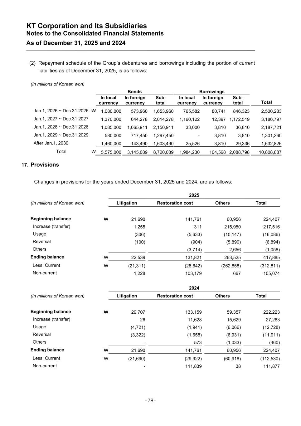 KT Corporation and Its Subsidiaries Notes to the Consolidated Financial Statements As of December 31, 2025 and 2024 (2) Repayment schedule of the Group’s debentures and borrowings including the portion of current liabilities as of December 31, 2025, is as follows: (In millions of Korean won) Bonds Borrowings Total In local currency In foreign currency Sub- total In local currency In foreign currency Sub- total Jan.1, 2026 ~ Dec.31 2026 ₩ 1,080,000 573,960 1,653,960 765,582 80,741 846,323 2,500,283 Jan.1, 2027 ~ Dec.31 2027 1,370,000 644,278 2,014,278 1,160,122 12,397 1,172,519 3,186,797 Jan.1, 2028 ~ Dec.31 2028 1,085,000 1,065,911 2,150,911 33,000 3,810 36,810 2,187,721 Jan.1, 2029 ~ Dec.31 2029 580,000 717,450 1,297,450 - 3,810 3,810 1,301,260 After Jan.1, 2030 1,460,000 143,490 1,603,490 25,526 3,810 29,336 1,632,826 Total ₩ 5,575,000 3,145,089 8,720,089 1,984,230 104,568 2,088,798 10,808,887 17. Provisions Changes in provisions for the years ended December 31, 2025 and 2024, are as follows: 2025 (In millions of Korean won) Litigation Restoration cost Others Total Beginning balance ₩ 21,690 141,761 60,956 224,407 Increase (transfer) 1,255 311 215,950 217,516 Usage (306) (5,633) (10,147) (16,086) Reversal (100) (904) (5,890) (6,894) Others - (3,714) 2,656 (1,058) Ending balance ₩ 22,539 131,821 263,525 417,885 Less: Current ₩ (21,311) (28,642) (262,858) (312,811) Non-current 1,228 103,179 667 105,074 2024 (In millions of Korean won) Litigation Restoration cost Others Total Beginning balance ₩ 29,707 133,159 59,357 222,223 Increase (transfer) 26 11,628 15,629 27,283 Usage (4,721) (1,941) (6,066) (12,728) Reversal (3,322) (1,658) (6,931) (11,911) Others - 573 (1,033) (460) Ending balance ₩ 21,690 141,761 60,956 224,407 Less: Current ₩ (21,690) (29,922) (60,918) (112,530) Non-current - 111,839 38 111,877 -78-