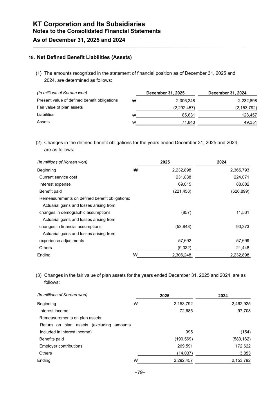 KT Corporation and Its Subsidiaries Notes to the Consolidated Financial Statements As of December 31, 2025 and 2024 18. Net Defined Benefit Liabilities (Assets) (1) The amounts recognized in the statement of financial position as of December 31, 2025 and 2024, are determined as follows: (In millions of Korean won) December 31, 2025 December 31, 2024 Present value of defined benefit obligations ₩ 2,306,248 2,232,898 Fair value of plan assets (2,292,457) (2,153,792) Liabilities ₩ 85,631 128,457 Assets ₩ 71,840 49,351 (2) Changes in the defined benefit obligations for the years ended December 31, 2025 and 2024, are as follows: (In millions of Korean won) 2025 2024 Beginning ₩ 2,232,898 2,365,793 Current service cost 231,838 224,071 Interest expense 69,015 88,882 Benefit paid (221,458) (626,899) Remeasurements on defined benefit obligations: Actuarial gains and losses arising from changes in demographic assumptions (857) 11,531 Actuarial gains and losses arising from changes in financial assumptions (53,848) 90,373 Actuarial gains and losses arising from experience adjustments 57,692 57,699 Others (9,032) 21,448 Ending ₩ 2,306,248 2,232,898 (3) Changes in the fair value of plan assets for the years ended December 31, 2025 and 2024, are as follows: (In millions of Korean won) 2025 2024 Beginning ₩ 2,153,792 2,462,925 Interest income 72,685 97,708 Remeasurements on plan assets: Return on plan assets (excluding amounts included in interest income) 995 (154) Benefits paid (190,569) (583,162) Employer contributions 269,591 172,622 Others (14,037) 3,853 Ending ₩ 2,292,457 2,153,792 -79-