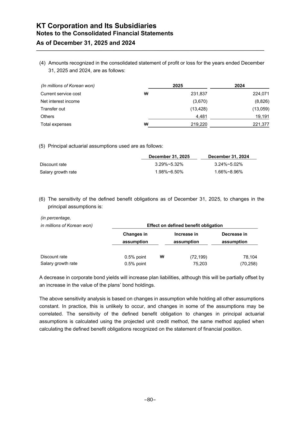 KT Corporation and Its Subsidiaries Notes to the Consolidated Financial Statements As of December 31, 2025 and 2024 (4) Amounts recognized in the consolidated statement of profit or loss for the years ended December 31, 2025 and 2024, are as follows: (In millions of Korean won) 2025 2024 Current service cost ₩ 231,837 224,071 Net interest income (3,670) (8,826) Transfer out (13,428) (13,059) Others 4,481 19,191 Total expenses ₩ 219,220 221,377 (5) Principal actuarial assumptions used are as follows: December 31, 2025 December 31, 2024 Discount rate 3.29%~5.32% 3.24%~5.02% Salary growth rate 1.98%~6.50% 1.66%~8.96% (6) The sensitivity of the defined benefit obligations as of December 31, 2025, to changes in the principal assumptions is: (in percentage, in millions of Korean won) Effect on defined benefit obligation Changes in assumption Increase in assumption Decrease in assumption Discount rate 0.5% point ₩ (72,199) 78,104 Salary growth rate 0.5% point 75,203 (70,258) A decrease in corporate bond yields will increase plan liabilities, although this will be partially offset by an increase in the value of the plans’ bond holdings. The above sensitivity analysis is based on changes in assumption while holding all other assumptions constant. In practice, this is unlikely to occur, and changes in some of the assumptions may be correlated. The sensitivity of the defined benefit obligation to changes in principal actuarial assumptions is calculated using the projected unit credit method, the same method applied when calculating the defined benefit obligations recognized on the statement of financial position. -80-