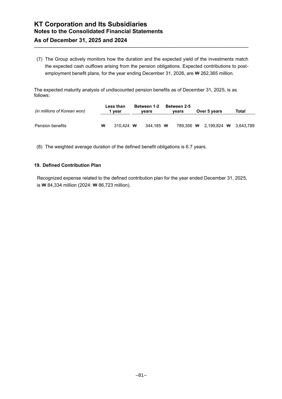 KT Corporation and Its Subsidiaries Notes to the Consolidated Financial Statements As of December 31, 2025 and 2024 (7) The Group actively monitors how the duration and the expected yield of the investments match the expected cash outflows arising from the pension obligations. Expected contributions to post- employment benefit plans, for the year ending December 31, 2026, are ₩ 262,365 million. The expected maturity analysis of undiscounted pension benefits as of December 31, 2025, is as follows: (in millions of Korean won) Less than 1 year Between 1-2 years Between 2-5 years Over 5 years Total Pension benefits ₩ 310,424 ₩ 344,185 ₩ 789,356 ₩ 2,199,824 ₩ 3,643,789 (8) The weighted average duration of the defined benefit obligations is 6.7 years. 19. Defined Contribution Plan Recognized expense related to the defined contribution plan for the year ended December 31, 2025, is ₩ 84,334 million (2024: ₩ 86,723 million). -81-
