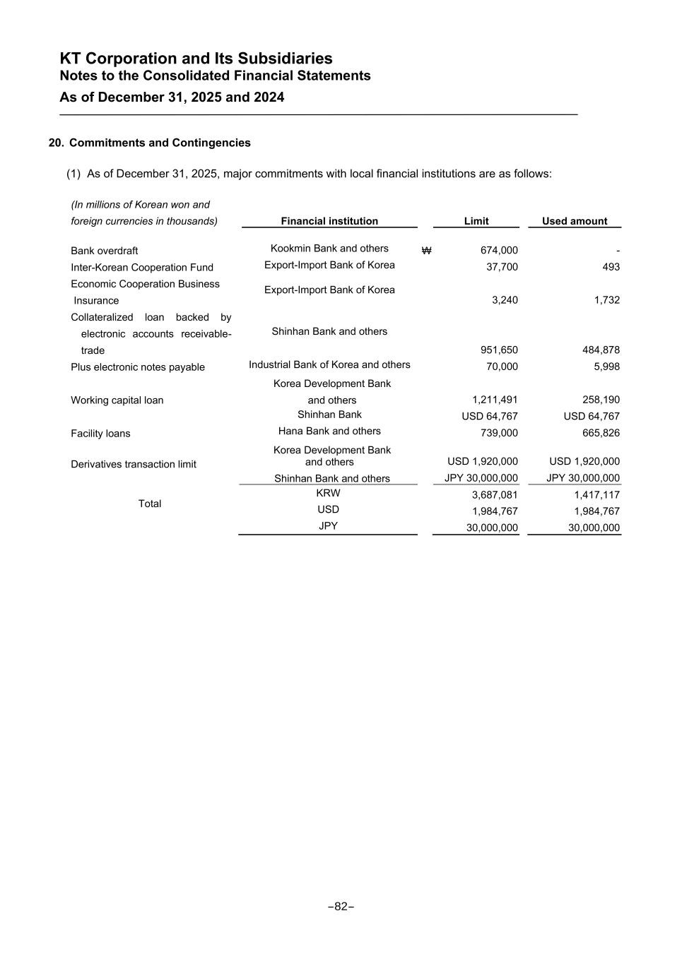 KT Corporation and Its Subsidiaries Notes to the Consolidated Financial Statements As of December 31, 2025 and 2024 20. Commitments and Contingencies (1) As of December 31, 2025, major commitments with local financial institutions are as follows: (In millions of Korean won and foreign currencies in thousands) Financial institution Limit Used amount Bank overdraft Kookmin Bank and others ₩ 674,000 - Inter-Korean Cooperation Fund Export-Import Bank of Korea 37,700 493 Economic Cooperation Business Insurance Export-Import Bank of Korea 3,240 1,732 Collateralized loan backed by electronic accounts receivable- trade Shinhan Bank and others 951,650 484,878 Plus electronic notes payable Industrial Bank of Korea and others 70,000 5,998 Working capital loan Korea Development Bank and others 1,211,491 258,190 Shinhan Bank USD 64,767 USD 64,767 Facility loans Hana Bank and others 739,000 665,826 Derivatives transaction limit Korea Development Bank and others USD 1,920,000 USD 1,920,000 Shinhan Bank and others JPY 30,000,000 JPY 30,000,000 Total KRW 3,687,081 1,417,117 USD 1,984,767 1,984,767 JPY 30,000,000 30,000,000 -82-