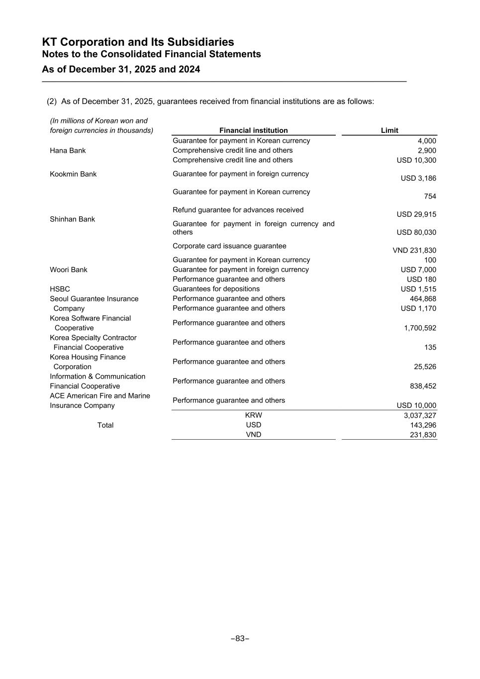 KT Corporation and Its Subsidiaries Notes to the Consolidated Financial Statements As of December 31, 2025 and 2024 (2) As of December 31, 2025, guarantees received from financial institutions are as follows: (In millions of Korean won and foreign currencies in thousands) Financial institution Limit Hana Bank Guarantee for payment in Korean currency 4,000 Comprehensive credit line and others 2,900 Comprehensive credit line and others USD 10,300 Kookmin Bank Guarantee for payment in foreign currency USD 3,186 Shinhan Bank Guarantee for payment in Korean currency 754 Refund guarantee for advances received USD 29,915 Guarantee for payment in foreign currency and others USD 80,030 Corporate card issuance guarantee VND 231,830 Woori Bank Guarantee for payment in Korean currency 100 Guarantee for payment in foreign currency USD 7,000 Performance guarantee and others USD 180 HSBC Guarantees for depositions USD 1,515 Seoul Guarantee Insurance Company Performance guarantee and others 464,868 Performance guarantee and others USD 1,170 Korea Software Financial Cooperative Performance guarantee and others 1,700,592 Korea Specialty Contractor Financial Cooperative Performance guarantee and others 135 Korea Housing Finance Corporation Performance guarantee and others 25,526 Information & Communication Financial Cooperative Performance guarantee and others 838,452 ACE American Fire and Marine Insurance Company Performance guarantee and others USD 10,000 Total KRW 3,037,327 USD 143,296 VND 231,830 -83-