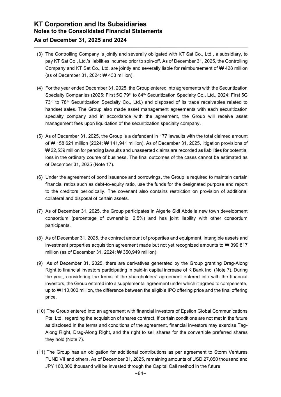 KT Corporation and Its Subsidiaries Notes to the Consolidated Financial Statements As of December 31, 2025 and 2024 (3) The Controlling Company is jointly and severally obligated with KT Sat Co., Ltd., a subsidiary, to pay KT Sat Co., Ltd.’s liabilities incurred prior to spin-off. As of December 31, 2025, the Controlling Company and KT Sat Co., Ltd. are jointly and severally liable for reimbursement of ₩ 428 million (as of December 31, 2024: ₩ 433 million). (4) For the year ended December 31, 2025, the Group entered into agreements with the Securitization Specialty Companies (2025: First 5G 79th to 84th Securitization Specialty Co., Ltd., 2024: First 5G 73rd to 78th Securitization Specialty Co., Ltd.) and disposed of its trade receivables related to handset sales. The Group also made asset management agreements with each securitization specialty company and in accordance with the agreement, the Group will receive asset management fees upon liquidation of the securitization specialty company. (5) As of December 31, 2025, the Group is a defendant in 177 lawsuits with the total claimed amount of ₩ 158,621 million (2024: ₩ 141,941 million). As of December 31, 2025, litigation provisions of ₩ 22,539 million for pending lawsuits and unasserted claims are recorded as liabilities for potential loss in the ordinary course of business. The final outcomes of the cases cannot be estimated as of December 31, 2025 (Note 17). (6) Under the agreement of bond issuance and borrowings, the Group is required to maintain certain financial ratios such as debt-to-equity ratio, use the funds for the designated purpose and report to the creditors periodically. The covenant also contains restriction on provision of additional collateral and disposal of certain assets. (7) As of December 31, 2025, the Group participates in Algerie Sidi Abdella new town development consortium (percentage of ownership: 2.5%) and has joint liability with other consortium participants. (8) As of December 31, 2025, the contract amount of properties and equipment, intangible assets and investment properties acquisition agreement made but not yet recognized amounts to ₩ 399,817 million (as of December 31, 2024: ₩ 350,949 million). (9) As of December 31, 2025, there are derivatives generated by the Group granting Drag-Along Right to financial investors participating in paid-in capital increase of K Bank Inc. (Note 7). During the year, considering the terms of the shareholders’ agreement entered into with the financial investors, the Group entered into a supplemental agreement under which it agreed to compensate, up to ₩110,000 million, the difference between the eligible IPO offering price and the final offering price. (10) The Group entered into an agreement with financial investors of Epsilon Global Communications Pte. Ltd. regarding the acquisition of shares contract. If certain conditions are not met in the future as disclosed in the terms and conditions of the agreement, financial investors may exercise Tag- Along Right, Drag-Along Right, and the right to sell shares for the convertible preferred shares they hold (Note 7). (11) The Group has an obligation for additional contributions as per agreement to Storm Ventures FUND VII and others. As of December 31, 2025, remaining amounts of USD 27,050 thousand and JPY 160,000 thousand will be invested through the Capital Call method in the future. -84-