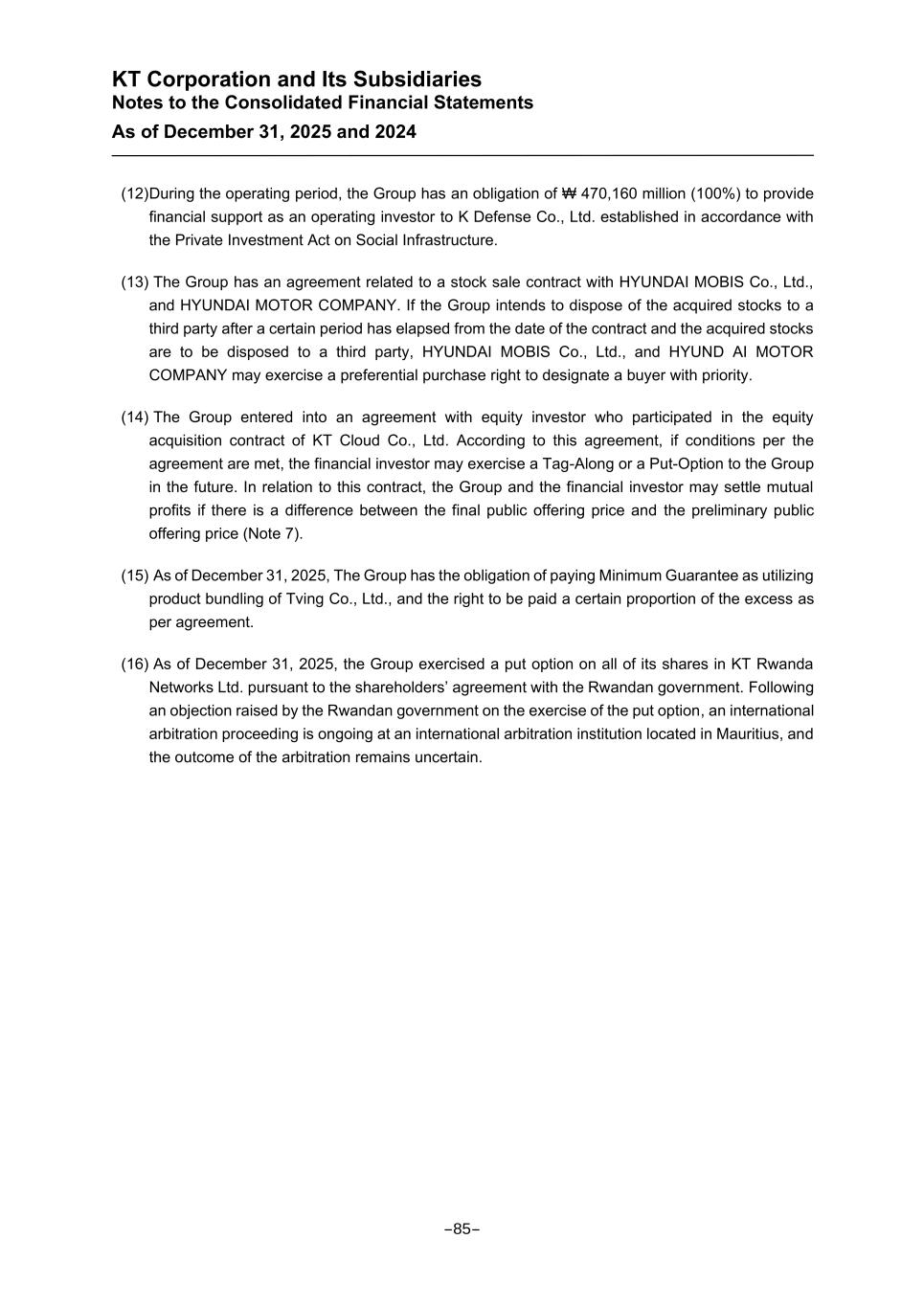 KT Corporation and Its Subsidiaries Notes to the Consolidated Financial Statements As of December 31, 2025 and 2024 (12) During the operating period, the Group has an obligation of ₩ 470,160 million (100%) to provide financial support as an operating investor to K Defense Co., Ltd. established in accordance with the Private Investment Act on Social Infrastructure. (13) The Group has an agreement related to a stock sale contract with HYUNDAI MOBIS Co., Ltd., and HYUNDAI MOTOR COMPANY. If the Group intends to dispose of the acquired stocks to a third party after a certain period has elapsed from the date of the contract and the acquired stocks are to be disposed to a third party, HYUNDAI MOBIS Co., Ltd., and HYUND AI MOTOR COMPANY may exercise a preferential purchase right to designate a buyer with priority. (14) The Group entered into an agreement with equity investor who participated in the equity acquisition contract of KT Cloud Co., Ltd. According to this agreement, if conditions per the agreement are met, the financial investor may exercise a Tag-Along or a Put-Option to the Group in the future. In relation to this contract, the Group and the financial investor may settle mutual profits if there is a difference between the final public offering price and the preliminary public offering price (Note 7). (15) As of December 31, 2025, The Group has the obligation of paying Minimum Guarantee as utilizing product bundling of Tving Co., Ltd., and the right to be paid a certain proportion of the excess as per agreement. (16) As of December 31, 2025, the Group exercised a put option on all of its shares in KT Rwanda Networks Ltd. pursuant to the shareholders’ agreement with the Rwandan government. Following an objection raised by the Rwandan government on the exercise of the put option, an international arbitration proceeding is ongoing at an international arbitration institution located in Mauritius, and the outcome of the arbitration remains uncertain. -85-