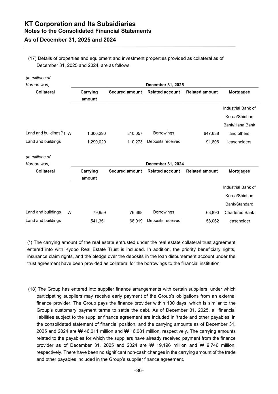 KT Corporation and Its Subsidiaries Notes to the Consolidated Financial Statements As of December 31, 2025 and 2024 (17) Details of properties and equipment and investment properties provided as collateral as of December 31, 2025 and 2024, are as follows (in millions of Korean won) December 31, 2025 Collateral Carrying amount Secured amount Related account Related amount Mortgagee Land and buildings(*) ₩ 1,300,290 810,057 Borrowings 647,638 Industrial Bank of Korea/Shinhan Bank/Hana Bank and others Land and buildings 1,290,020 110,273 Deposits received 91,806 leaseholders (in millions of Korean won) December 31, 2024 Collateral Carrying amount Secured amount Related account Related amount Mortgagee Land and buildings ₩ 79,959 76,668 Borrowings 63,890 Industrial Bank of Korea/Shinhan Bank/Standard Chartered Bank Land and buildings 541,351 68,019 Deposits received 58,062 leaseholder (*) The carrying amount of the real estate entrusted under the real estate collateral trust agreement entered into with Kyobo Real Estate Trust is included. In addition, the priority beneficiary rights, insurance claim rights, and the pledge over the deposits in the loan disbursement account under the trust agreement have been provided as collateral for the borrowings to the financial institution (18) The Group has entered into supplier finance arrangements with certain suppliers, under which participating suppliers may receive early payment of the Group’s obligations from an external finance provider. The Group pays the finance provider within 100 days, which is similar to the Group’s customary payment terms to settle the debt. As of December 31, 2025, all financial liabilities subject to the supplier finance agreement are included in ‘trade and other payables’ in the consolidated statement of financial position, and the carrying amounts as of December 31, 2025 and 2024 are ₩ 46,011 million and ₩ 16,081 million, respectively. The carrying amounts related to the payables for which the suppliers have already received payment from the finance provider as of December 31, 2025 and 2024 are ₩ 19,196 million and ₩ 9,746 million, respectively. There have been no significant non-cash changes in the carrying amount of the trade and other payables included in the Group’s supplier finance agreement. -86-