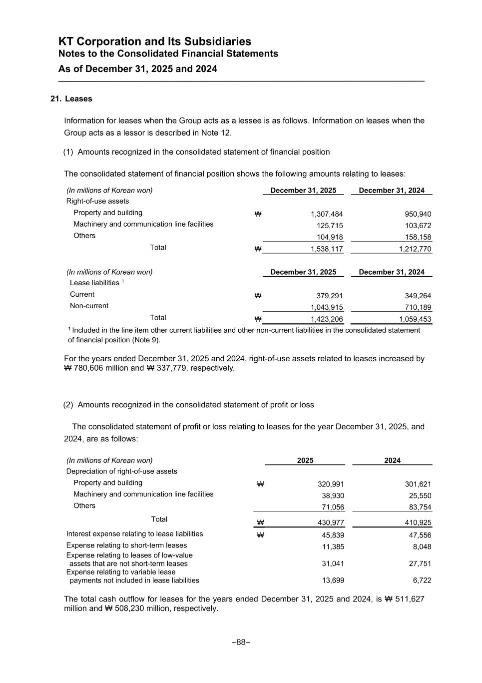 KT Corporation and Its Subsidiaries Notes to the Consolidated Financial Statements As of December 31, 2025 and 2024 21. Leases Information for leases when the Group acts as a lessee is as follows. Information on leases when the Group acts as a lessor is described in Note 12. (1) Amounts recognized in the consolidated statement of financial position The consolidated statement of financial position shows the following amounts relating to leases: (In millions of Korean won) December 31, 2025 December 31, 2024 Right-of-use assets Property and building ₩ 1,307,484 950,940 Machinery and communication line facilities 125,715 103,672 Others 104,918 158,158 Total ₩ 1,538,117 1,212,770 (In millions of Korean won) December 31, 2025 December 31, 2024 Lease liabilities 1 Current ₩ 379,291 349,264 Non-current 1,043,915 710,189 Total ₩ 1,423,206 1,059,453 1 Included in the line item other current liabilities and other non-current liabilities in the consolidated statement of financial position (Note 9). For the years ended December 31, 2025 and 2024, right-of-use assets related to leases increased by ₩ 780,606 million and ₩ 337,779, respectively. (2) Amounts recognized in the consolidated statement of profit or loss The consolidated statement of profit or loss relating to leases for the year December 31, 2025, and 2024, are as follows: (In millions of Korean won) 2025 2024 Depreciation of right-of-use assets Property and building ₩ 320,991 301,621 Machinery and communication line facilities 38,930 25,550 Others 71,056 83,754 Total ₩ 430,977 410,925 Interest expense relating to lease liabilities ₩ 45,839 47,556 Expense relating to short-term leases 11,385 8,048 Expense relating to leases of low-value assets that are not short-term leases 31,041 27,751 Expense relating to variable lease payments not included in lease liabilities 13,699 6,722 The total cash outflow for leases for the years ended December 31, 2025 and 2024, is ₩ 511,627 million and ₩ 508,230 million, respectively. -88-
