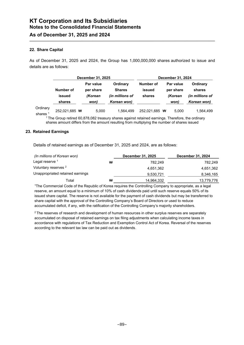 KT Corporation and Its Subsidiaries Notes to the Consolidated Financial Statements As of December 31, 2025 and 2024 22. Share Capital As of December 31, 2025 and 2024, the Group has 1,000,000,000 shares authorized to issue and details are as follows: December 31, 2025 December 31, 2024 Number of issued shares Par value per share (Korean won) Ordinary Shares (in millions of Korean won) Number of issued shares Par value per share (Korean won) Ordinary shares (in millions of Korean won) Ordinary shares 1 252,021,685 ₩ 5,000 1,564,499 252,021,685 ₩ 5,000 1,564,499 1 The Group retired 60,878,082 treasury shares against retained earnings. Therefore, the ordinary shares amount differs from the amount resulting from multiplying the number of shares issued 23. Retained Earnings Details of retained earnings as of December 31, 2025 and 2024, are as follows: (In millions of Korean won) December 31, 2025 December 31, 2024 Legal reserve 1 ₩ 782,249 782,249 Voluntary reserves 2 4,651,362 4,651,362 Unappropriated retained earnings 9,530,721 8,346,165 Total ₩ 14,964,332 13,779,776 1The Commercial Code of the Republic of Korea requires the Controlling Company to appropriate, as a legal reserve, an amount equal to a minimum of 10% of cash dividends paid until such reserve equals 50% of its issued share capital. The reserve is not available for the payment of cash dividends but may be transferred to share capital with the approval of the Controlling Company’s Board of Directors or used to reduce accumulated deficit, if any, with the ratification of the Controlling Company’s majority shareholders. 2 The reserves of research and development of human resources in other surplus reserves are separately accumulated on disposal of retained earnings on tax filing adjustments when calculating income taxes in accordance with regulations of Tax Reduction and Exemption Control Act of Korea. Reversal of the reserves according to the relevant tax law can be paid out as dividends. -89-