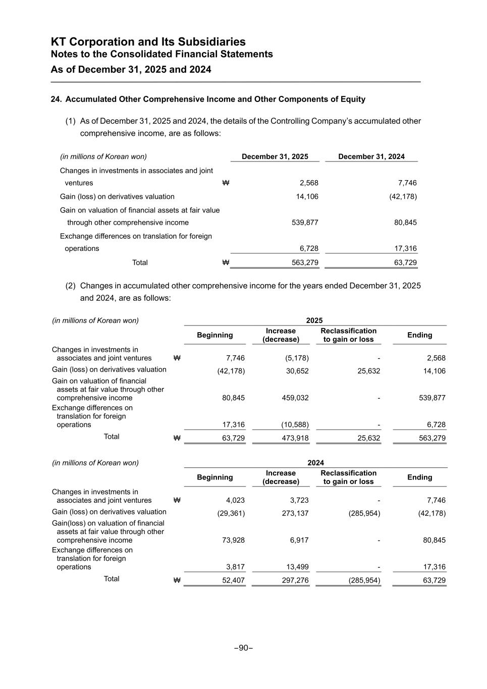 KT Corporation and Its Subsidiaries Notes to the Consolidated Financial Statements As of December 31, 2025 and 2024 24. Accumulated Other Comprehensive Income and Other Components of Equity (1) As of December 31, 2025 and 2024, the details of the Controlling Company’s accumulated other comprehensive income, are as follows: (in millions of Korean won) December 31, 2025 December 31, 2024 Changes in investments in associates and joint ventures ₩ 2,568 7,746 Gain (loss) on derivatives valuation 14,106 (42,178) Gain on valuation of financial assets at fair value through other comprehensive income 539,877 80,845 Exchange differences on translation for foreign operations 6,728 17,316 Total ₩ 563,279 63,729 (2) Changes in accumulated other comprehensive income for the years ended December 31, 2025 and 2024, are as follows: (in millions of Korean won) 2025 Beginning Increase (decrease) Reclassification to gain or loss Ending Changes in investments in associates and joint ventures ₩ 7,746 (5,178) - 2,568 Gain (loss) on derivatives valuation (42,178) 30,652 25,632 14,106 Gain on valuation of financial assets at fair value through other comprehensive income 80,845 459,032 - 539,877 Exchange differences on translation for foreign operations 17,316 (10,588) - 6,728 Total ₩ 63,729 473,918 25,632 563,279 (in millions of Korean won) 2024 Beginning Increase (decrease) Reclassification to gain or loss Ending Changes in investments in associates and joint ventures ₩ 4,023 3,723 - 7,746 Gain (loss) on derivatives valuation (29,361) 273,137 (285,954) (42,178) Gain(loss) on valuation of financial assets at fair value through other comprehensive income 73,928 6,917 - 80,845 Exchange differences on translation for foreign operations 3,817 13,499 - 17,316 Total ₩ 52,407 297,276 (285,954) 63,729 -90-