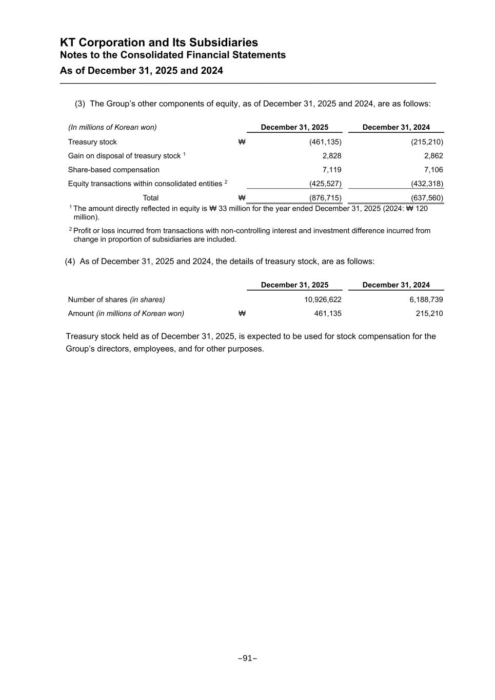 KT Corporation and Its Subsidiaries Notes to the Consolidated Financial Statements As of December 31, 2025 and 2024 (3) The Group’s other components of equity, as of December 31, 2025 and 2024, are as follows: (In millions of Korean won) December 31, 2025 December 31, 2024 Treasury stock ₩ (461,135) (215,210) Gain on disposal of treasury stock 1 2,828 2,862 Share-based compensation 7,119 7,106 Equity transactions within consolidated entities 2 (425,527) (432,318) Total ₩ (876,715) (637,560) 1 The amount directly reflected in equity is ₩ 33 million for the year ended December 31, 2025 (2024: ₩ 120 million). 2 Profit or loss incurred from transactions with non-controlling interest and investment difference incurred from change in proportion of subsidiaries are included. (4) As of December 31, 2025 and 2024, the details of treasury stock, are as follows: December 31, 2025 December 31, 2024 Number of shares (in shares) 10,926,622 6,188,739 Amount (in millions of Korean won) ₩ 461,135 215,210 Treasury stock held as of December 31, 2025, is expected to be used for stock compensation for the Group’s directors, employees, and for other purposes. -91-