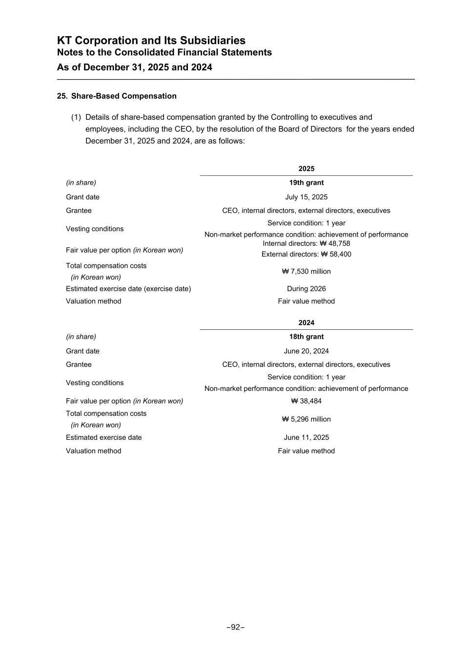 KT Corporation and Its Subsidiaries Notes to the Consolidated Financial Statements As of December 31, 2025 and 2024 25. Share-Based Compensation (1) Details of share-based compensation granted by the Controlling to executives and employees, including the CEO, by the resolution of the Board of Directors for the years ended December 31, 2025 and 2024, are as follows: 2025 (in share) 19th grant Grant date July 15, 2025 Grantee CEO, internal directors, external directors, executives Vesting conditions Service condition: 1 year Non-market performance condition: achievement of performance Fair value per option (in Korean won) Internal directors: ₩ 48,758 External directors: ₩ 58,400 Total compensation costs (in Korean won) ₩ 7,530 million Estimated exercise date (exercise date) During 2026 Valuation method Fair value method 2024 (in share) 18th grant Grant date June 20, 2024 Grantee CEO, internal directors, external directors, executives Vesting conditions Service condition: 1 year Non-market performance condition: achievement of performance Fair value per option (in Korean won) ₩ 38,484 Total compensation costs (in Korean won) ₩ 5,296 million Estimated exercise date June 11, 2025 Valuation method Fair value method -92-