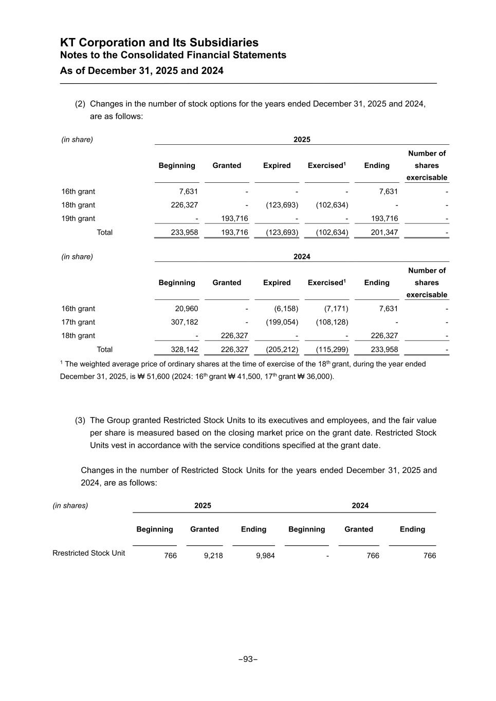 KT Corporation and Its Subsidiaries Notes to the Consolidated Financial Statements As of December 31, 2025 and 2024 (2) Changes in the number of stock options for the years ended December 31, 2025 and 2024, are as follows: (in share) 2025 Beginning Granted Expired Exercised1 Ending Number of shares exercisable 16th grant 7,631 - - - 7,631 - 18th grant 226,327 - (123,693) (102,634) - - 19th grant - 193,716 - - 193,716 - Total 233,958 193,716 (123,693) (102,634) 201,347 - (in share) 2024 Beginning Granted Expired Exercised1 Ending Number of shares exercisable 16th grant 20,960 - (6,158) (7,171) 7,631 - 17th grant 307,182 - (199,054) (108,128) - - 18th grant - 226,327 - - 226,327 - Total 328,142 226,327 (205,212) (115,299) 233,958 - 1 The weighted average price of ordinary shares at the time of exercise of the 18th grant, during the year ended December 31, 2025, is ₩ 51,600 (2024: 16th grant ₩ 41,500, 17th grant ₩ 36,000). (3) The Group granted Restricted Stock Units to its executives and employees, and the fair value per share is measured based on the closing market price on the grant date. Restricted Stock Units vest in accordance with the service conditions specified at the grant date. Changes in the number of Restricted Stock Units for the years ended December 31, 2025 and 2024, are as follows: (in shares) 2025 2024 Beginning Granted Ending Beginning Granted Ending Rrestricted Stock Unit 766 9,218 9,984 - 766 766 -93-