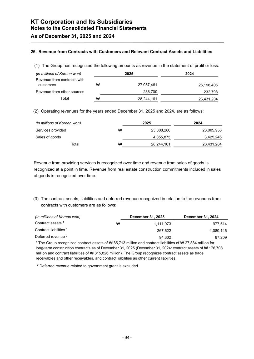 KT Corporation and Its Subsidiaries Notes to the Consolidated Financial Statements As of December 31, 2025 and 2024 26. Revenue from Contracts with Customers and Relevant Contract Assets and Liabilities (1) The Group has recognized the following amounts as revenue in the statement of profit or loss: (in millions of Korean won) 2025 2024 Revenue from contracts with customers ₩ 27,957,461 26,198,406 Revenue from other sources 286,700 232,798 Total ₩ 28,244,161 26,431,204 (2) Operating revenues for the years ended December 31, 2025 and 2024, are as follows: (in millions of Korean won) 2025 2024 Services provided ₩ 23,388,286 23,005,958 Sales of goods 4,855,875 3,425,246 Total ₩ 28,244,161 26,431,204 Revenue from providing services is recognized over time and revenue from sales of goods is recognized at a point in time. Revenue from real estate construction commitments included in sales of goods is recognized over time. (3) The contract assets, liabilities and deferred revenue recognized in relation to the revenues from contracts with customers are as follows: (In millions of Korean won) December 31, 2025 December 31, 2024 Contract assets 1 ₩ 1,111,973 977,514 Contract liabilities 1 267,622 1,089,146 Deferred revenue 2 94,302 87,209 1 The Group recognized contract assets of ₩ 85,713 million and contract liabilities of ₩ 27,884 million for long-term construction contracts as of December 31, 2025 (December 31, 2024: contract assets of ₩ 176,708 million and contract liabilities of ₩ 815,826 million). The Group recognizes contract assets as trade receivables and other receivables, and contract liabilities as other current liabilities. 2 Deferred revenue related to government grant is excluded. -94-