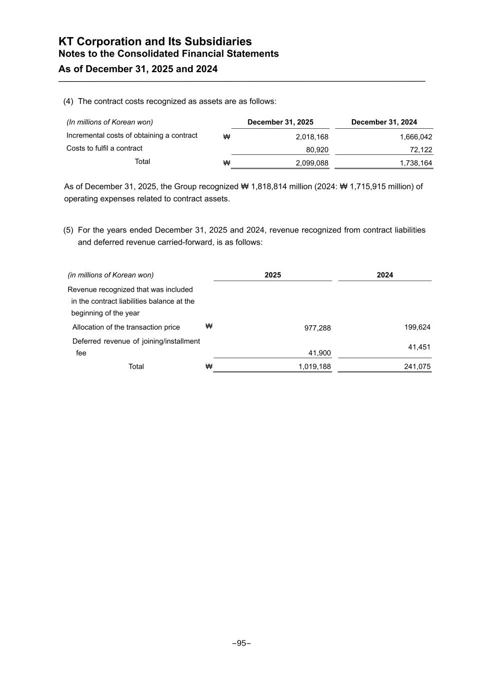 KT Corporation and Its Subsidiaries Notes to the Consolidated Financial Statements As of December 31, 2025 and 2024 (4) The contract costs recognized as assets are as follows: (In millions of Korean won) December 31, 2025 December 31, 2024 Incremental costs of obtaining a contract ₩ 2,018,168 1,666,042 Costs to fulfil a contract 80,920 72,122 Total ₩ 2,099,088 1,738,164 As of December 31, 2025, the Group recognized ₩ 1,818,814 million (2024: ₩ 1,715,915 million) of operating expenses related to contract assets. (5) For the years ended December 31, 2025 and 2024, revenue recognized from contract liabilities and deferred revenue carried-forward, is as follows: (in millions of Korean won) 2025 2024 Revenue recognized that was included in the contract liabilities balance at the beginning of the year Allocation of the transaction price ₩ 977,288 199,624 Deferred revenue of joining/installment fee 41,900 41,451 Total ₩ 1,019,188 241,075 -95-