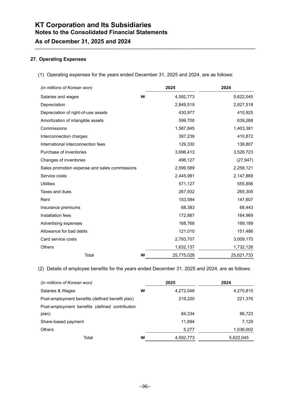 KT Corporation and Its Subsidiaries Notes to the Consolidated Financial Statements As of December 31, 2025 and 2024 27. Operating Expenses (1) Operating expenses for the years ended December 31, 2025 and 2024, are as follows: (in millions of Korean won) 2025 2024 Salaries and wages ₩ 4,592,773 5,622,045 Depreciation 2,849,519 2,827,518 Depreciation of right-of-use assets 430,977 410,925 Amortization of intangible assets 599,700 639,268 Commissions 1,587,845 1,403,381 Interconnection charges 397,239 410,872 International interconnection fees 129,330 138,807 Purchase of inventories 3,696,413 3,526,723 Changes of inventories 496,127 (27,947) Sales promotion expense and sales commissions 2,599,589 2,258,121 Service costs 2,445,981 2,147,869 Utilities 571,127 555,856 Taxes and dues 267,932 265,305 Rent 153,584 147,607 Insurance premiums 68,383 68,443 Installation fees 172,887 164,969 Advertising expenses 168,768 169,189 Allowance for bad debts 121,010 151,486 Card service costs 2,793,707 3,009,170 Others 1,632,137 1,732,126 Total ₩ 25,775,028 25,621,733 (2) Details of employee benefits for the years ended December 31, 2025 and 2024, are as follows: (in millions of Korean won) 2025 2024 Salaries & Wages ₩ 4,272,048 4,270,815 Post-employment benefits (defined benefit plan) 219,220 221,376 Post-employment benefits (defined contribution plan) 84,334 86,723 Share-based payment 11,894 7,129 Others 5,277 1,036,002 Total ₩ 4,592,773 5,622,045 -96-