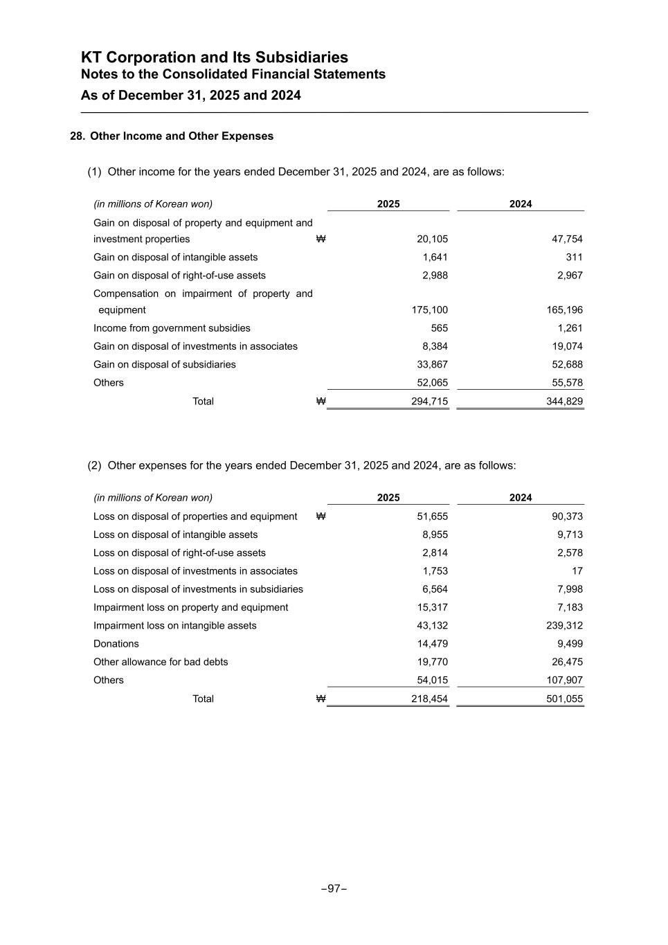 KT Corporation and Its Subsidiaries Notes to the Consolidated Financial Statements As of December 31, 2025 and 2024 28. Other Income and Other Expenses (1) Other income for the years ended December 31, 2025 and 2024, are as follows: (in millions of Korean won) 2025 2024 Gain on disposal of property and equipment and investment properties ₩ 20,105 47,754 Gain on disposal of intangible assets 1,641 311 Gain on disposal of right-of-use assets 2,988 2,967 Compensation on impairment of property and equipment 175,100 165,196 Income from government subsidies 565 1,261 Gain on disposal of investments in associates 8,384 19,074 Gain on disposal of subsidiaries 33,867 52,688 Others 52,065 55,578 Total ₩ 294,715 344,829 (2) Other expenses for the years ended December 31, 2025 and 2024, are as follows: (in millions of Korean won) 2025 2024 Loss on disposal of properties and equipment ₩ 51,655 90,373 Loss on disposal of intangible assets 8,955 9,713 Loss on disposal of right-of-use assets 2,814 2,578 Loss on disposal of investments in associates 1,753 17 Loss on disposal of investments in subsidiaries 6,564 7,998 Impairment loss on property and equipment 15,317 7,183 Impairment loss on intangible assets 43,132 239,312 Donations 14,479 9,499 Other allowance for bad debts 19,770 26,475 Others 54,015 107,907 Total ₩ 218,454 501,055 -97-