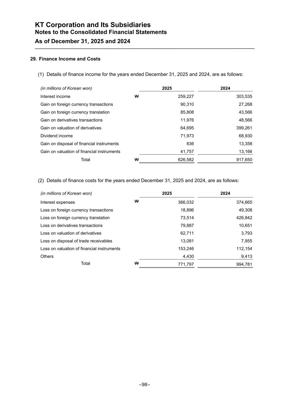 KT Corporation and Its Subsidiaries Notes to the Consolidated Financial Statements As of December 31, 2025 and 2024 29. Finance Income and Costs (1) Details of finance income for the years ended December 31, 2025 and 2024, are as follows: (in millions of Korean won) 2025 2024 Interest income ₩ 259,227 303,535 Gain on foreign currency transactions 90,310 27,268 Gain on foreign currency translation 85,808 43,566 Gain on derivatives transactions 11,976 48,566 Gain on valuation of derivatives 64,695 399,261 Dividend income 71,973 68,930 Gain on disposal of financial instruments 836 13,358 Gain on valuation of financial instruments 41,757 13,166 Total ₩ 626,582 917,650 (2) Details of finance costs for the years ended December 31, 2025 and 2024, are as follows: (in millions of Korean won) 2025 2024 Interest expenses ₩ 366,032 374,665 Loss on foreign currency transactions 18,896 49,308 Loss on foreign currency translation 73,514 426,842 Loss on derivatives transactions 79,887 10,651 Loss on valuation of derivatives 62,711 3,793 Loss on disposal of trade receivables 13,081 7,955 Loss on valuation of financial instruments 153,246 112,154 Others 4,430 9,413 Total ₩ 771,797 994,781 -98-