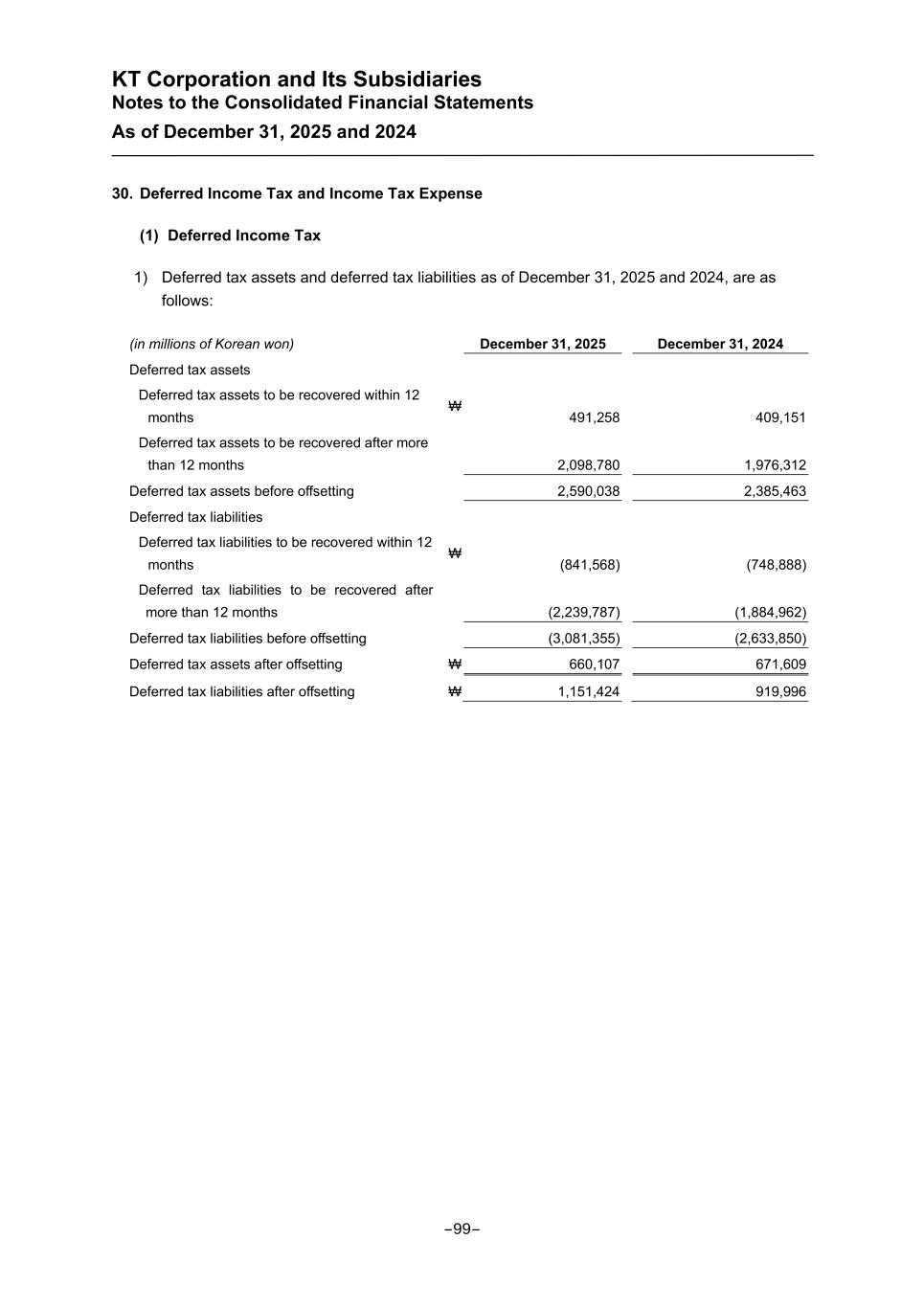 KT Corporation and Its Subsidiaries Notes to the Consolidated Financial Statements As of December 31, 2025 and 2024 30. Deferred Income Tax and Income Tax Expense (1) Deferred Income Tax 1) Deferred tax assets and deferred tax liabilities as of December 31, 2025 and 2024, are as follows: (in millions of Korean won) December 31, 2025 December 31, 2024 Deferred tax assets Deferred tax assets to be recovered within 12 months ₩ 491,258 409,151 Deferred tax assets to be recovered after more than 12 months 2,098,780 1,976,312 Deferred tax assets before offsetting 2,590,038 2,385,463 Deferred tax liabilities Deferred tax liabilities to be recovered within 12 months ₩ (841,568) (748,888) Deferred tax liabilities to be recovered after more than 12 months (2,239,787) (1,884,962) Deferred tax liabilities before offsetting (3,081,355) (2,633,850) Deferred tax assets after offsetting ₩ 660,107 671,609 Deferred tax liabilities after offsetting ₩ 1,151,424 919,996 -99-