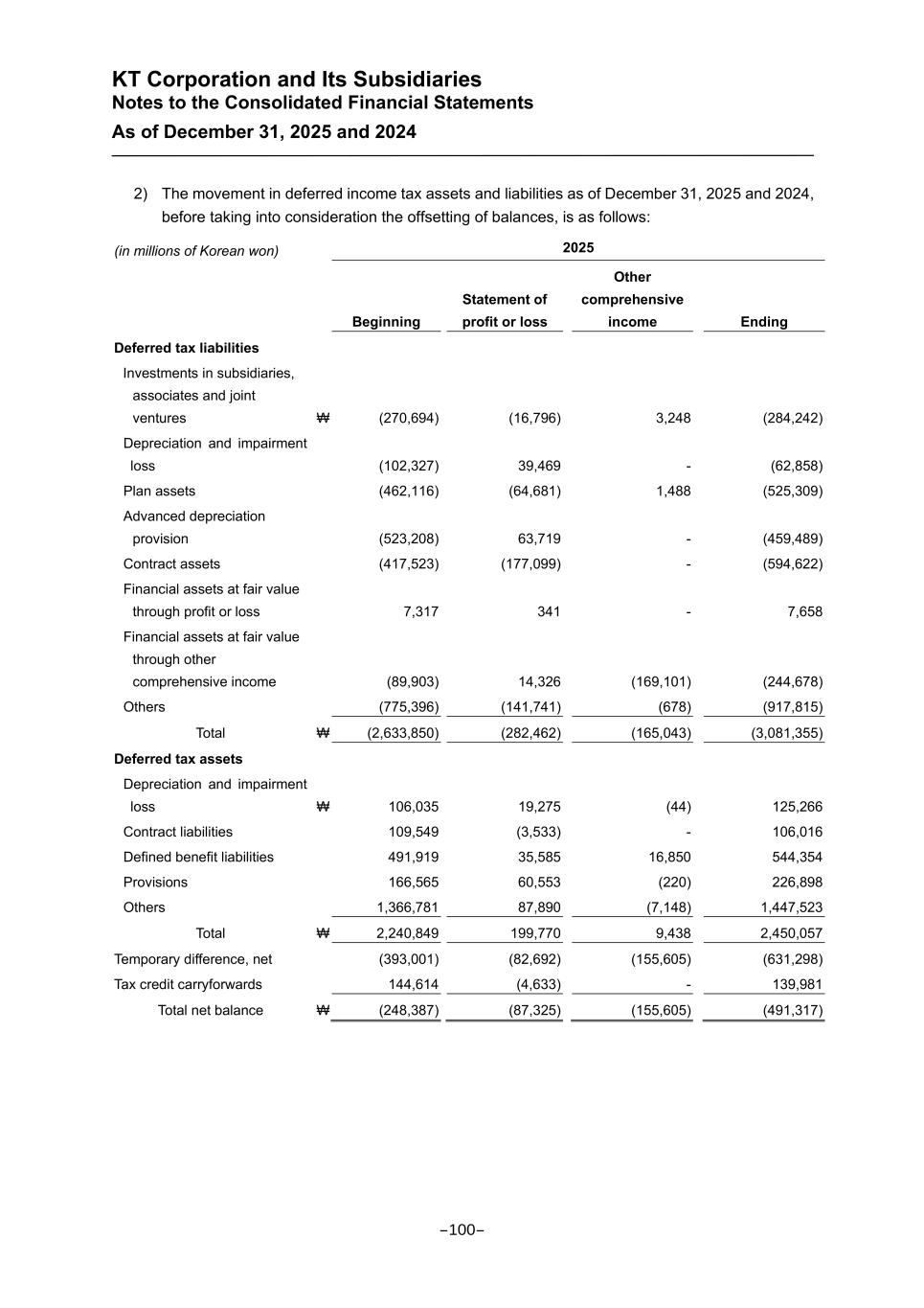KT Corporation and Its Subsidiaries Notes to the Consolidated Financial Statements As of December 31, 2025 and 2024 2) The movement in deferred income tax assets and liabilities as of December 31, 2025 and 2024, before taking into consideration the offsetting of balances, is as follows: (in millions of Korean won) 2025 Beginning Statement of profit or loss Other comprehensive income Ending Deferred tax liabilities Investments in subsidiaries, associates and joint ventures ₩ (270,694) (16,796) 3,248 (284,242) Depreciation and impairment loss (102,327) 39,469 - (62,858) Plan assets (462,116) (64,681) 1,488 (525,309) Advanced depreciation provision (523,208) 63,719 - (459,489) Contract assets (417,523) (177,099) - (594,622) Financial assets at fair value through profit or loss 7,317 341 - 7,658 Financial assets at fair value through other comprehensive income (89,903) 14,326 (169,101) (244,678) Others (775,396) (141,741) (678) (917,815) Total ₩ (2,633,850) (282,462) (165,043) (3,081,355) Deferred tax assets Depreciation and impairment loss ₩ 106,035 19,275 (44) 125,266 Contract liabilities 109,549 (3,533) - 106,016 Defined benefit liabilities 491,919 35,585 16,850 544,354 Provisions 166,565 60,553 (220) 226,898 Others 1,366,781 87,890 (7,148) 1,447,523 Total ₩ 2,240,849 199,770 9,438 2,450,057 Temporary difference, net (393,001) (82,692) (155,605) (631,298) Tax credit carryforwards 144,614 (4,633) - 139,981 Total net balance ₩ (248,387) (87,325) (155,605) (491,317) -100-