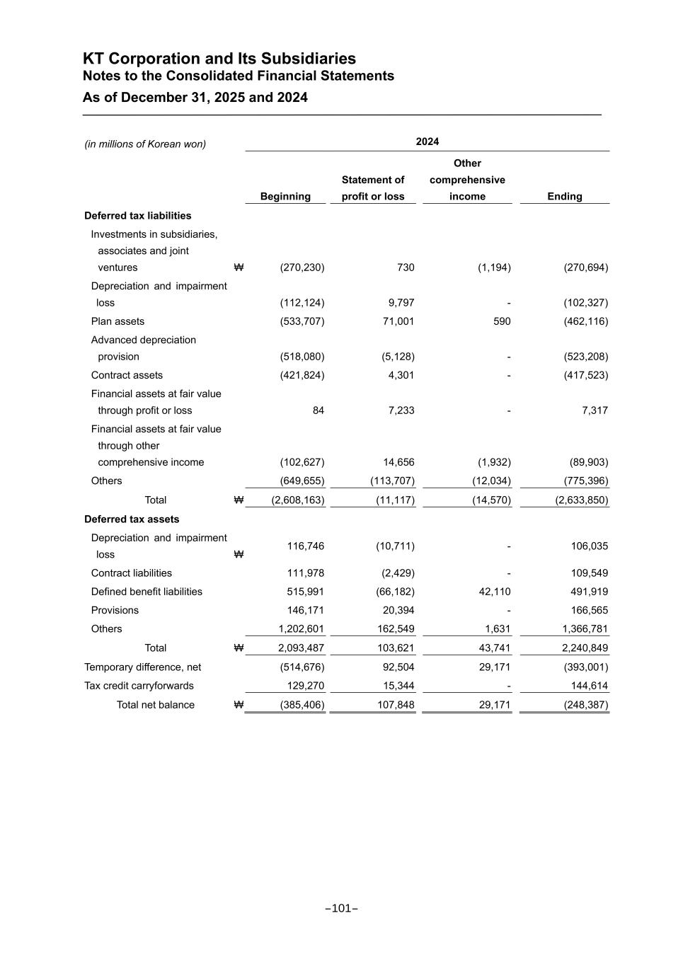 KT Corporation and Its Subsidiaries Notes to the Consolidated Financial Statements As of December 31, 2025 and 2024 (in millions of Korean won) 2024 Beginning Statement of profit or loss Other comprehensive income Ending Deferred tax liabilities Investments in subsidiaries, associates and joint ventures ₩ (270,230) 730 (1,194) (270,694) Depreciation and impairment loss (112,124) 9,797 - (102,327) Plan assets (533,707) 71,001 590 (462,116) Advanced depreciation provision (518,080) (5,128) - (523,208) Contract assets (421,824) 4,301 - (417,523) Financial assets at fair value through profit or loss 84 7,233 - 7,317 Financial assets at fair value through other comprehensive income (102,627) 14,656 (1,932) (89,903) Others (649,655) (113,707) (12,034) (775,396) Total ₩ (2,608,163) (11,117) (14,570) (2,633,850) Deferred tax assets Depreciation and impairment loss ₩ 116,746 (10,711) - 106,035 Contract liabilities 111,978 (2,429) - 109,549 Defined benefit liabilities 515,991 (66,182) 42,110 491,919 Provisions 146,171 20,394 - 166,565 Others 1,202,601 162,549 1,631 1,366,781 Total ₩ 2,093,487 103,621 43,741 2,240,849 Temporary difference, net (514,676) 92,504 29,171 (393,001) Tax credit carryforwards 129,270 15,344 - 144,614 Total net balance ₩ (385,406) 107,848 29,171 (248,387) -101-