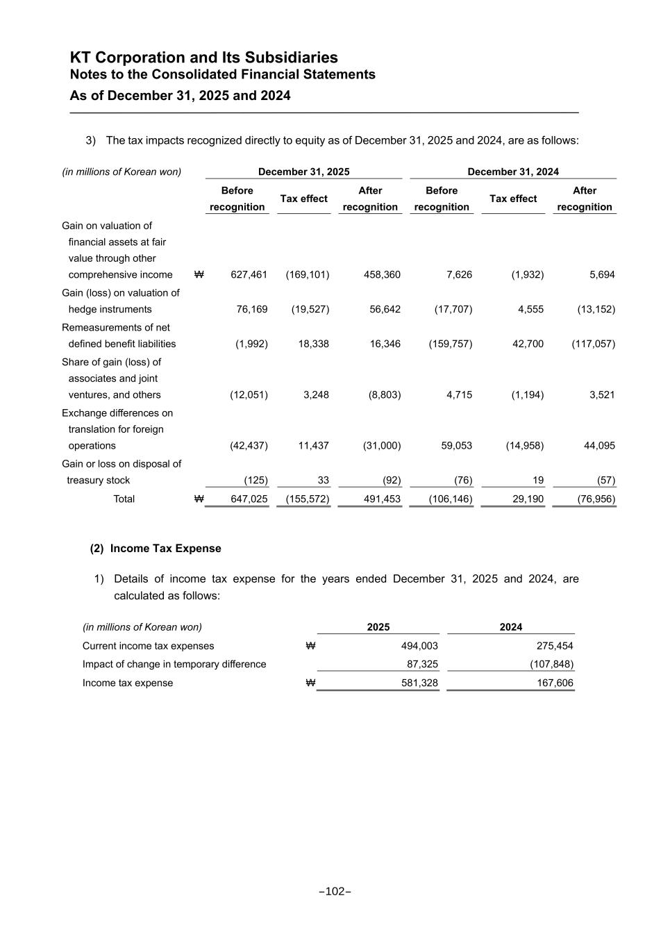 KT Corporation and Its Subsidiaries Notes to the Consolidated Financial Statements As of December 31, 2025 and 2024 3) The tax impacts recognized directly to equity as of December 31, 2025 and 2024, are as follows: (in millions of Korean won) December 31, 2025 December 31, 2024 Before recognition Tax effect After recognition Before recognition Tax effect After recognition Gain on valuation of financial assets at fair value through other comprehensive income ₩ 627,461 (169,101) 458,360 7,626 (1,932) 5,694 Gain (loss) on valuation of hedge instruments 76,169 (19,527) 56,642 (17,707) 4,555 (13,152) Remeasurements of net defined benefit liabilities (1,992) 18,338 16,346 (159,757) 42,700 (117,057) Share of gain (loss) of associates and joint ventures, and others (12,051) 3,248 (8,803) 4,715 (1,194) 3,521 Exchange differences on translation for foreign operations (42,437) 11,437 (31,000) 59,053 (14,958) 44,095 Gain or loss on disposal of treasury stock (125) 33 (92) (76) 19 (57) Total ₩ 647,025 (155,572) 491,453 (106,146) 29,190 (76,956) (2) Income Tax Expense 1) Details of income tax expense for the years ended December 31, 2025 and 2024, are calculated as follows: (in millions of Korean won) 2025 2024 Current income tax expenses ₩ 494,003 275,454 Impact of change in temporary difference 87,325 (107,848) Income tax expense ₩ 581,328 167,606 -102-
