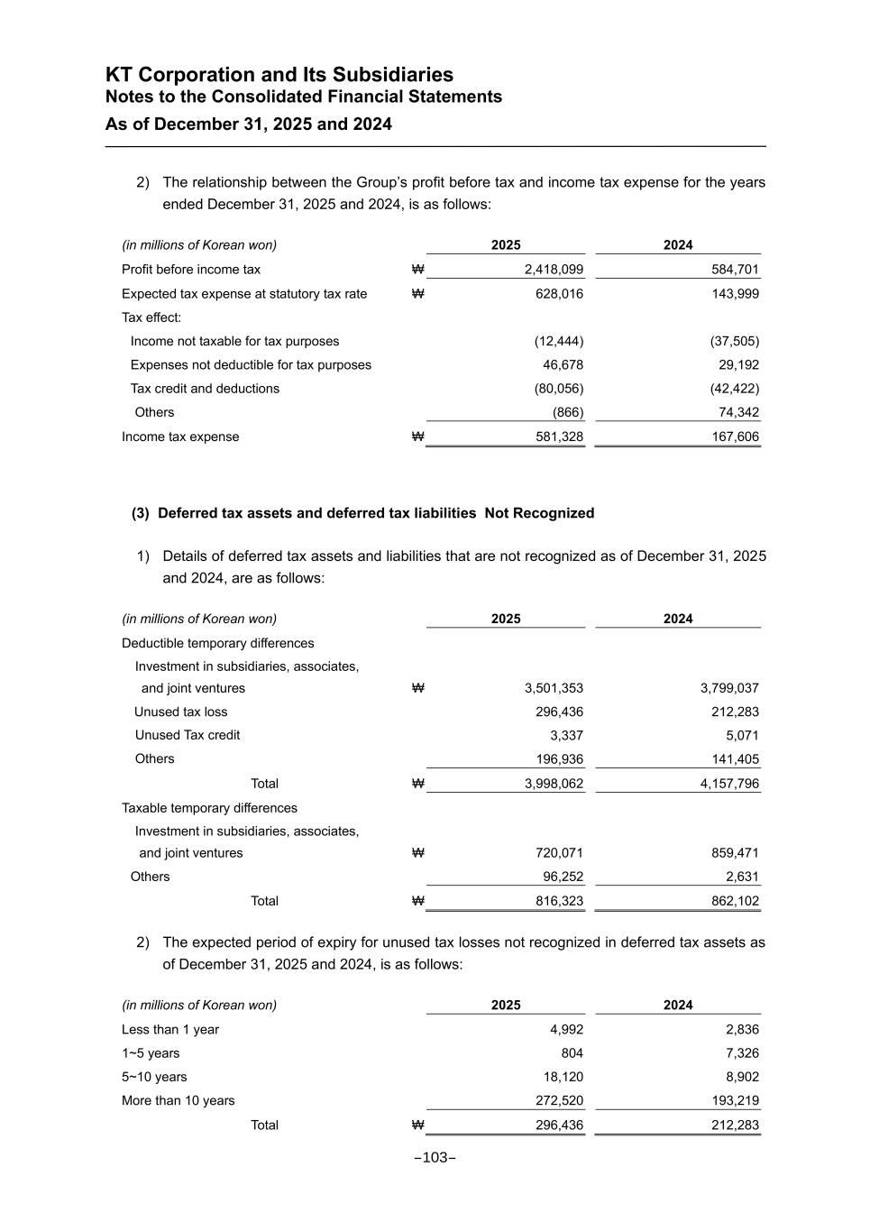 KT Corporation and Its Subsidiaries Notes to the Consolidated Financial Statements As of December 31, 2025 and 2024 2) The relationship between the Group’s profit before tax and income tax expense for the years ended December 31, 2025 and 2024, is as follows: (in millions of Korean won) 2025 2024 Profit before income tax ₩ 2,418,099 584,701 Expected tax expense at statutory tax rate ₩ 628,016 143,999 Tax effect: Income not taxable for tax purposes (12,444) (37,505) Expenses not deductible for tax purposes 46,678 29,192 Tax credit and deductions (80,056) (42,422) Others (866) 74,342 Income tax expense ₩ 581,328 167,606 (3) Deferred tax assets and deferred tax liabilities Not Recognized 1) Details of deferred tax assets and liabilities that are not recognized as of December 31, 2025 and 2024, are as follows: (in millions of Korean won) 2025 2024 Deductible temporary differences Investment in subsidiaries, associates, and joint ventures ₩ 3,501,353 3,799,037 Unused tax loss 296,436 212,283 Unused Tax credit 3,337 5,071 Others 196,936 141,405 Total ₩ 3,998,062 4,157,796 Taxable temporary differences Investment in subsidiaries, associates, and joint ventures ₩ 720,071 859,471 Others 96,252 2,631 Total ₩ 816,323 862,102 2) The expected period of expiry for unused tax losses not recognized in deferred tax assets as of December 31, 2025 and 2024, is as follows: (in millions of Korean won) 2025 2024 Less than 1 year 4,992 2,836 1~5 years 804 7,326 5~10 years 18,120 8,902 More than 10 years 272,520 193,219 Total ₩ 296,436 212,283 -103-