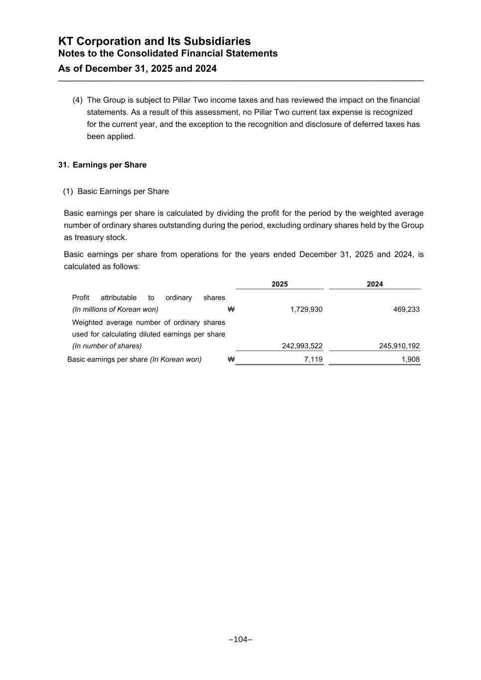 KT Corporation and Its Subsidiaries Notes to the Consolidated Financial Statements As of December 31, 2025 and 2024 (4) The Group is subject to Pillar Two income taxes and has reviewed the impact on the financial statements. As a result of this assessment, no Pillar Two current tax expense is recognized for the current year, and the exception to the recognition and disclosure of deferred taxes has been applied. 31. Earnings per Share (1) Basic Earnings per Share Basic earnings per share is calculated by dividing the profit for the period by the weighted average number of ordinary shares outstanding during the period, excluding ordinary shares held by the Group as treasury stock. Basic earnings per share from operations for the years ended December 31, 2025 and 2024, is calculated as follows: 2025 2024 Profit attributable to ordinary shares (In millions of Korean won) ₩ 1,729,930 469,233 Weighted average number of ordinary shares used for calculating diluted earnings per share (In number of shares) 242,993,522 245,910,192 Basic earnings per share (In Korean won) ₩ 7,119 1,908 -104-