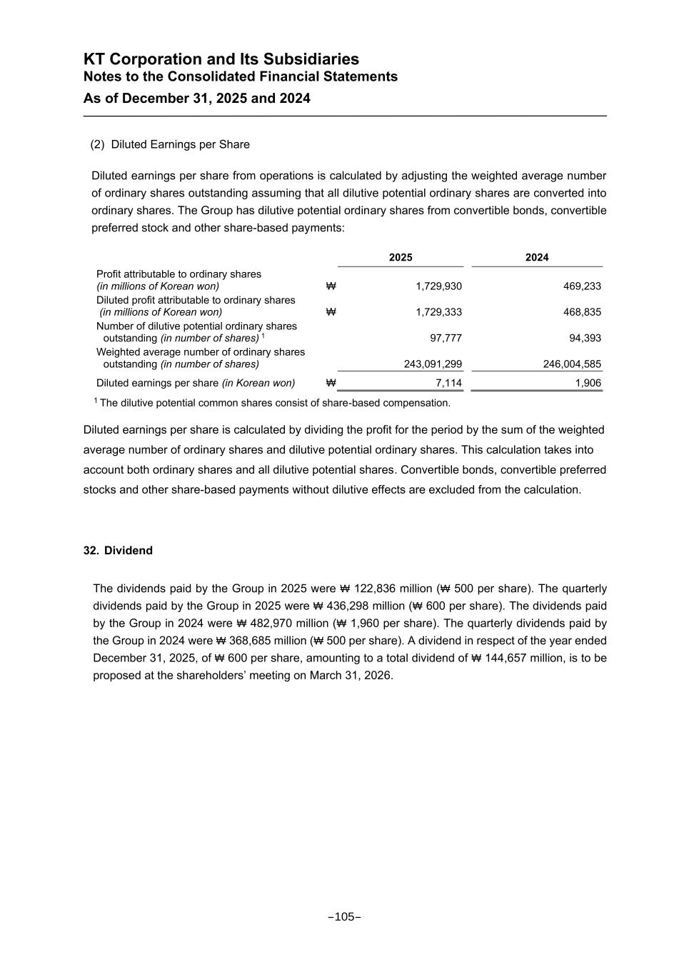 KT Corporation and Its Subsidiaries Notes to the Consolidated Financial Statements As of December 31, 2025 and 2024 (2) Diluted Earnings per Share Diluted earnings per share from operations is calculated by adjusting the weighted average number of ordinary shares outstanding assuming that all dilutive potential ordinary shares are converted into ordinary shares. The Group has dilutive potential ordinary shares from convertible bonds, convertible preferred stock and other share-based payments: 2025 2024 Profit attributable to ordinary shares (in millions of Korean won) ₩ 1,729,930 469,233 Diluted profit attributable to ordinary shares (in millions of Korean won) ₩ 1,729,333 468,835 Number of dilutive potential ordinary shares outstanding (in number of shares) 1 97,777 94,393 Weighted average number of ordinary shares outstanding (in number of shares) 243,091,299 246,004,585 Diluted earnings per share (in Korean won) ₩ 7,114 1,906 1 The dilutive potential common shares consist of share-based compensation. Diluted earnings per share is calculated by dividing the profit for the period by the sum of the weighted average number of ordinary shares and dilutive potential ordinary shares. This calculation takes into account both ordinary shares and all dilutive potential shares. Convertible bonds, convertible preferred stocks and other share-based payments without dilutive effects are excluded from the calculation. 32. Dividend The dividends paid by the Group in 2025 were ₩ 122,836 million (₩ 500 per share). The quarterly dividends paid by the Group in 2025 were ₩ 436,298 million (₩ 600 per share). The dividends paid by the Group in 2024 were ₩ 482,970 million (₩ 1,960 per share). The quarterly dividends paid by the Group in 2024 were ₩ 368,685 million (₩ 500 per share). A dividend in respect of the year ended December 31, 2025, of ₩ 600 per share, amounting to a total dividend of ₩ 144,657 million, is to be proposed at the shareholders’ meeting on March 31, 2026. -105-