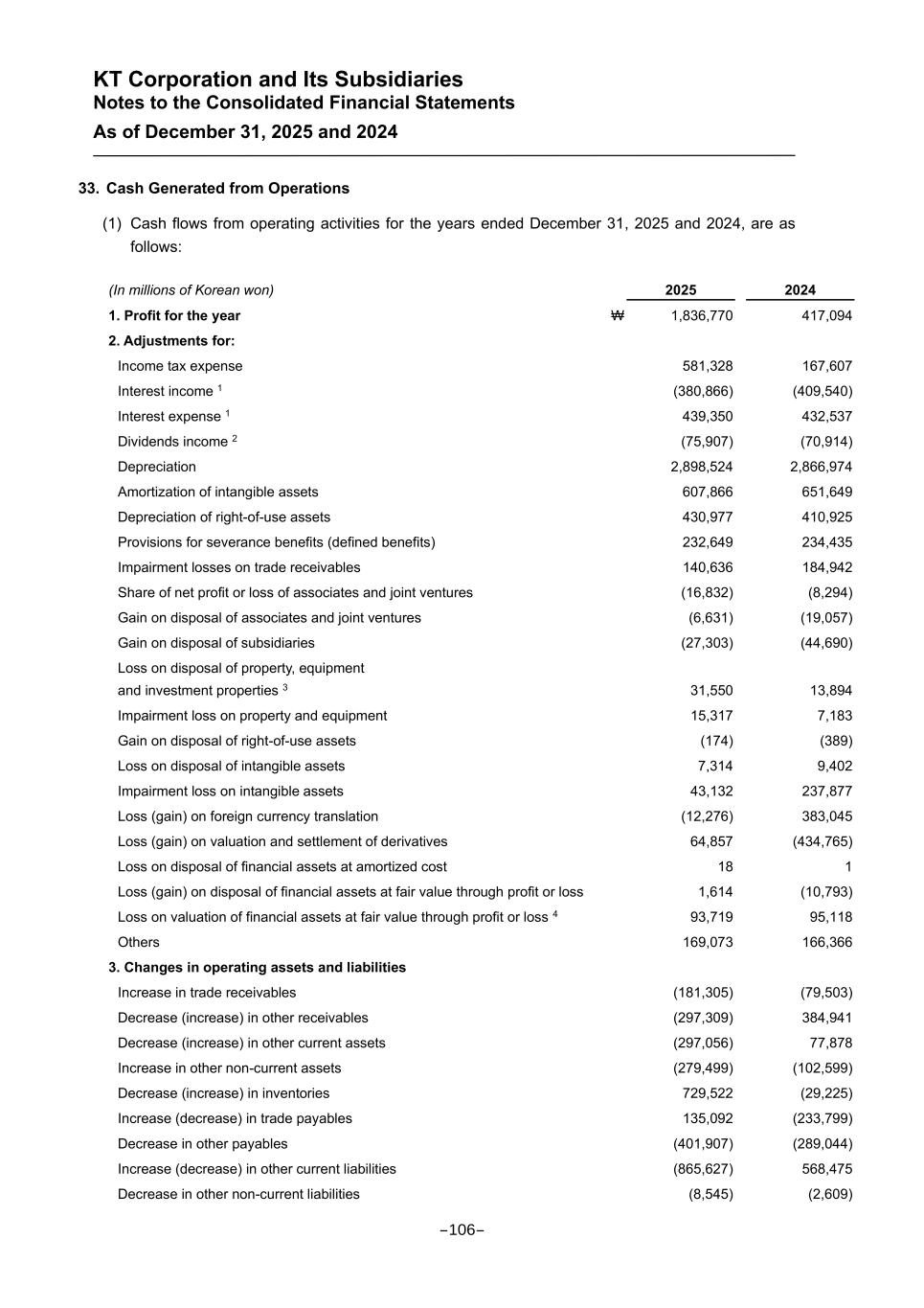 KT Corporation and Its Subsidiaries Notes to the Consolidated Financial Statements As of December 31, 2025 and 2024 33. Cash Generated from Operations (1) Cash flows from operating activities for the years ended December 31, 2025 and 2024, are as follows: (In millions of Korean won) 2025 2024 1. Profit for the year ₩ 1,836,770 417,094 2. Adjustments for: Income tax expense 581,328 167,607 Interest income 1 (380,866) (409,540) Interest expense 1 439,350 432,537 Dividends income 2 (75,907) (70,914) Depreciation 2,898,524 2,866,974 Amortization of intangible assets 607,866 651,649 Depreciation of right-of-use assets 430,977 410,925 Provisions for severance benefits (defined benefits) 232,649 234,435 Impairment losses on trade receivables 140,636 184,942 Share of net profit or loss of associates and joint ventures (16,832) (8,294) Gain on disposal of associates and joint ventures (6,631) (19,057) Gain on disposal of subsidiaries (27,303) (44,690) Loss on disposal of property, equipment and investment properties 3 31,550 13,894 Impairment loss on property and equipment 15,317 7,183 Gain on disposal of right-of-use assets (174) (389) Loss on disposal of intangible assets 7,314 9,402 Impairment loss on intangible assets 43,132 237,877 Loss (gain) on foreign currency translation (12,276) 383,045 Loss (gain) on valuation and settlement of derivatives 64,857 (434,765) Loss on disposal of financial assets at amortized cost 18 1 Loss (gain) on disposal of financial assets at fair value through profit or loss 1,614 (10,793) Loss on valuation of financial assets at fair value through profit or loss 4 93,719 95,118 Others 169,073 166,366 3. Changes in operating assets and liabilities Increase in trade receivables (181,305) (79,503) Decrease (increase) in other receivables (297,309) 384,941 Decrease (increase) in other current assets (297,056) 77,878 Increase in other non-current assets (279,499) (102,599) Decrease (increase) in inventories 729,522 (29,225) Increase (decrease) in trade payables 135,092 (233,799) Decrease in other payables (401,907) (289,044) Increase (decrease) in other current liabilities (865,627) 568,475 Decrease in other non-current liabilities (8,545) (2,609) -106-