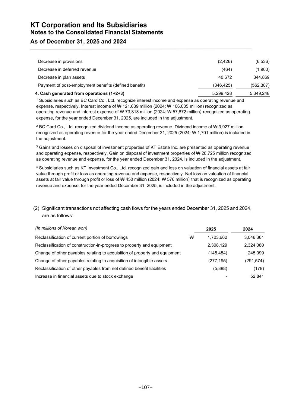 KT Corporation and Its Subsidiaries Notes to the Consolidated Financial Statements As of December 31, 2025 and 2024 Decrease in provisions (2,426) (6,536) Decrease in deferred revenue (464) (1,900) Decrease in plan assets 40,672 344,869 Payment of post-employment benefits (defined benefit) (346,425) (562,307) 4. Cash generated from operations (1+2+3) 5,299,428 5,349,248 1 Subsidiaries such as BC Card Co., Ltd. recognize interest income and expense as operating revenue and expense, respectively. Interest income of ₩ 121,639 million (2024: ₩ 106,005 million) recognized as operating revenue and interest expense of ₩ 73,318 million (2024: ₩ 57,872 million) recognized as operating expense, for the year ended December 31, 2025, are included in the adjustment. 2 BC Card Co., Ltd. recognized dividend income as operating revenue. Dividend income of ₩ 3,927 million recognized as operating revenue for the year ended December 31, 2025 (2024: ₩ 1,701 million) is included in the adjustment. 3 Gains and losses on disposal of investment properties of KT Estate Inc. are presented as operating revenue and operating expense, respectively. Gain on disposal of investment properties of ₩ 28,725 million recognized as operating revenue and expense, for the year ended December 31, 2024, is included in the adjustment. 4 Subsidiaries such as KT Investment Co., Ltd. recognized gain and loss on valuation of financial assets at fair value through profit or loss as operating revenue and expense, respectively. Net loss on valuation of financial assets at fair value through profit or loss of ₩ 450 million (2024: ₩ 576 million) that is recognized as operating revenue and expense, for the year ended December 31, 2025, is included in the adjustment. (2) Significant transactions not affecting cash flows for the years ended December 31, 2025 and 2024, are as follows: (In millions of Korean won) 2025 2024 Reclassification of current portion of borrowings ₩ 1,703,662 3,046,361 Reclassification of construction-in-progress to property and equipment 2,308,129 2,324,080 Change of other payables relating to acquisition of property and equipment (145,484) 245,099 Change of other payables relating to acquisition of intangible assets (277,195) (291,574) Reclassification of other payables from net defined benefit liabilities (5,888) (178) Increase in financial assets due to stock exchange - 52,841 -107-