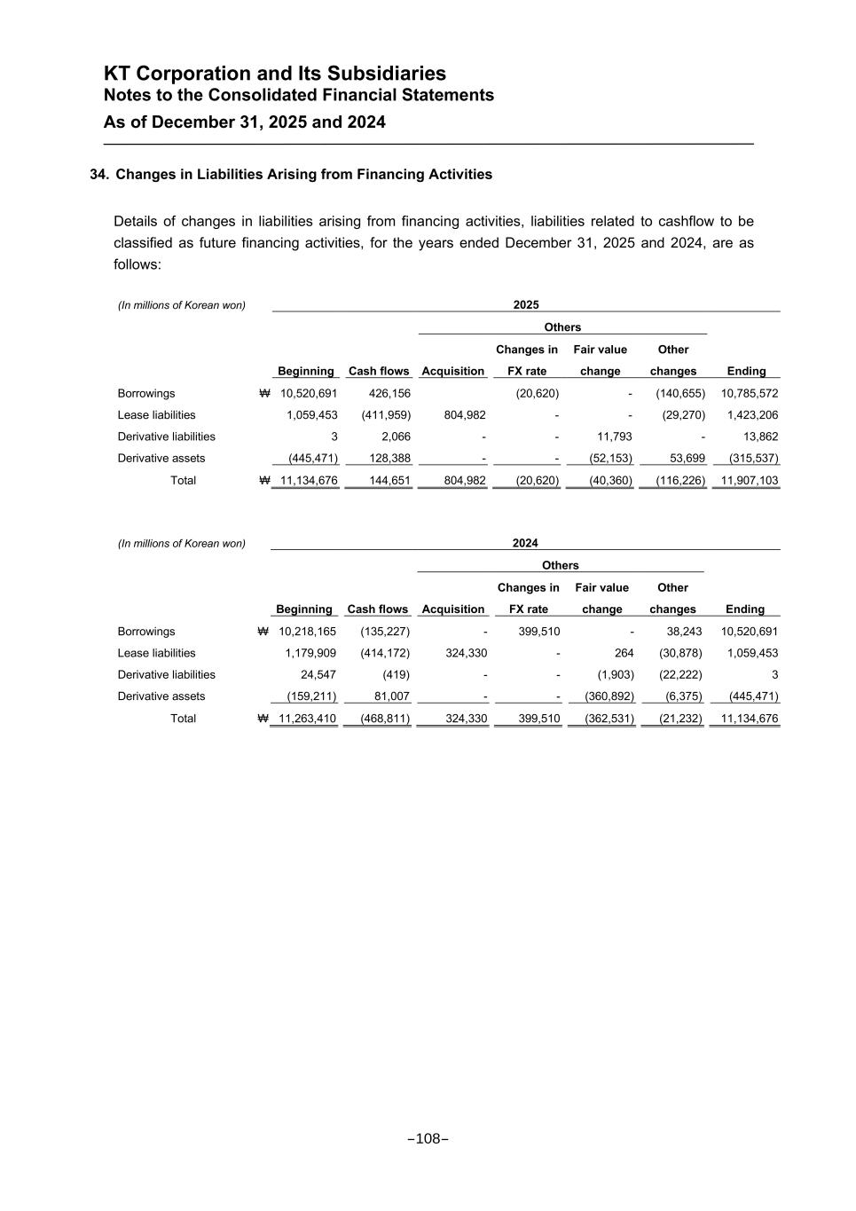 KT Corporation and Its Subsidiaries Notes to the Consolidated Financial Statements As of December 31, 2025 and 2024 34. Changes in Liabilities Arising from Financing Activities Details of changes in liabilities arising from financing activities, liabilities related to cashflow to be classified as future financing activities, for the years ended December 31, 2025 and 2024, are as follows: (In millions of Korean won) 2025 Others Beginning Cash flows Acquisition Changes in FX rate Fair value change Other changes Ending Borrowings ₩ 10,520,691 426,156 (20,620) - (140,655) 10,785,572 Lease liabilities 1,059,453 (411,959) 804,982 - - (29,270) 1,423,206 Derivative liabilities 3 2,066 - - 11,793 - 13,862 Derivative assets (445,471) 128,388 - - (52,153) 53,699 (315,537) Total ₩ 11,134,676 144,651 804,982 (20,620) (40,360) (116,226) 11,907,103 (In millions of Korean won) 2024 Others Beginning Cash flows Acquisition Changes in FX rate Fair value change Other changes Ending Borrowings ₩ 10,218,165 (135,227) - 399,510 - 38,243 10,520,691 Lease liabilities 1,179,909 (414,172) 324,330 - 264 (30,878) 1,059,453 Derivative liabilities 24,547 (419) - - (1,903) (22,222) 3 Derivative assets (159,211) 81,007 - - (360,892) (6,375) (445,471) Total ₩ 11,263,410 (468,811) 324,330 399,510 (362,531) (21,232) 11,134,676 -108-