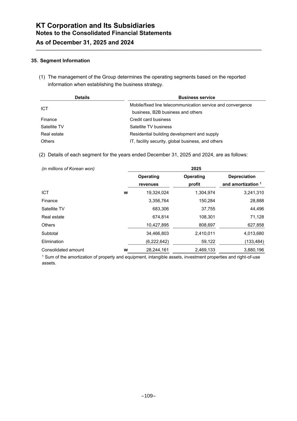 KT Corporation and Its Subsidiaries Notes to the Consolidated Financial Statements As of December 31, 2025 and 2024 35. Segment Information (1) The management of the Group determines the operating segments based on the reported information when establishing the business strategy. Details Business service ICT Mobile/fixed line telecommunication service and convergence business, B2B business and others Finance Credit card business Satellite TV Satellite TV business Real estate Residential building development and supply Others IT, facility security, global business, and others (2) Details of each segment for the years ended December 31, 2025 and 2024, are as follows: (in millions of Korean won) 2025 Operating revenues Operating profit Depreciation and amortization 1 ICT ₩ 19,324,024 1,304,974 3,241,310 Finance 3,356,764 150,284 28,888 Satellite TV 683,306 37,755 44,496 Real estate 674,814 108,301 71,128 Others 10,427,895 808,697 627,858 Subtotal 34,466,803 2,410,011 4,013,680 Elimination (6,222,642) 59,122 (133,484) Consolidated amount ₩ 28,244,161 2,469,133 3,880,196 1 Sum of the amortization of property and equipment, intangible assets, investment properties and right-of-use assets. -109-