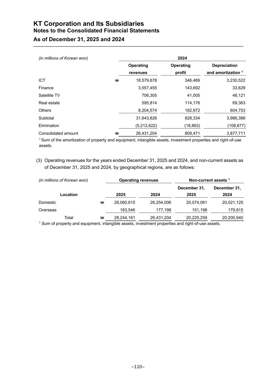 KT Corporation and Its Subsidiaries Notes to the Consolidated Financial Statements As of December 31, 2025 and 2024 (in millions of Korean won) 2024 Operating revenues Operating profit Depreciation and amortization 1 ICT ₩ 18,579,678 346,489 3,230,522 Finance 3,557,455 143,692 33,629 Satellite TV 706,305 41,005 48,121 Real estate 595,814 114,176 69,363 Others 8,204,574 182,972 604,753 Subtotal 31,643,826 828,334 3,986,388 Elimination (5,212,622) (18,863) (108,677) Consolidated amount ₩ 26,431,204 809,471 3,877,711 1 Sum of the amortization of property and equipment, intangible assets, investment properties and right-of-use assets. (3) Operating revenues for the years ended December 31, 2025 and 2024, and non-current assets as of December 31, 2025 and 2024, by geographical regions, are as follows: (in millions of Korean won) Operating revenues Non-current assets 1 Location 2025 2024 December 31, 2025 December 31, 2024 Domestic ₩ 28,060,615 26,254,006 20,074,061 20,021,125 Overseas 183,546 177,198 151,198 179,815 Total ₩ 28,244,161 26,431,204 20,225,259 20,200,940 1 Sum of property and equipment, intangible assets, investment properties and right-of-use assets. -110-