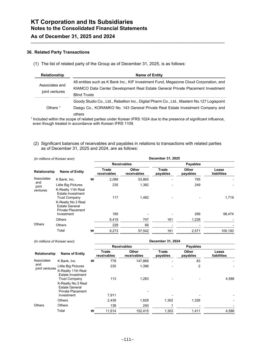 KT Corporation and Its Subsidiaries Notes to the Consolidated Financial Statements As of December 31, 2025 and 2024 36. Related Party Transactions (1) The list of related party of the Group as of December 31, 2025, is as follows: Relationship Name of Entity Associates and joint ventures 48 entities such as K Bank Inc., KIF Investment Fund, Megazone Cloud Corporation, and KIAMCO Data Center Development Real Estate General Private Placement Investment Blind Trusts Others 1 Goody Studio Co., Ltd., Rebellion Inc., Digital Pharm Co., Ltd., Mastern No.127 Logispoint Daegu Co., KORAMKO No. 143 General Private Real Estate Investment Company and others 1 Included within the scope of related parties under Korean IFRS 1024 due to the presence of significant influence, even though treated in accordance with Korean IFRS 1109. (2) Significant balances of receivables and payables in relations to transactions with related parties as of December 31, 2025 and 2024, are as follows: (In millions of Korean won) December 31, 2025 Receivables Payables Relationship Name of Entity Trade receivables Other receivables Trade payables Other payables Lease liabilities Associates and joint ventures K Bank, Inc. ₩ 2,089 53,865 - 795 - Little Big Pictures 235 1,382 - 249 - K-Realty 11th Real Estate Investment Trust Company 117 1,482 - - 1,719 K-Realty No.3 Real Estate General Private Placement Investment 185 - - 299 98,474 Others 6,419 747 161 1,228 - Others Others 228 66 - - - Total ₩ 9,273 57,542 161 2,571 100,193 (In millions of Korean won) December 31, 2024 Receivables Payables Relationship Name of Entity Trade receivables Other receivables Trade payables Other payables Lease liabilities Associates and joint ventures K Bank, Inc. ₩ 778 147,868 - 83 - Little Big Pictures 235 1,396 - 2 - K-Realty 11th Real Estate Investment Trust Company 113 1,283 - - 4,588 K-Realty No.3 Real Estate General Private Placement Investment 7,911 - - - - Others 2,439 1,628 1,302 1,326 - Others Others 138 240 1 - - Total ₩ 11,614 152,415 1,303 1,411 4,588 -111-