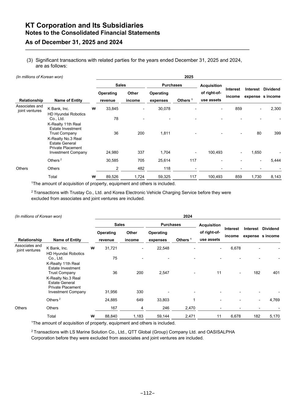 KT Corporation and Its Subsidiaries Notes to the Consolidated Financial Statements As of December 31, 2025 and 2024 (3) Significant transactions with related parties for the years ended December 31, 2025 and 2024, are as follows: 1The amount of acquisition of property, equipment and others is included. 2 Transactions with Trustay Co., Ltd. and Korea Electronic Vehicle Charging Service before they were excluded from associates and joint ventures are included. 1The amount of acquisition of property, equipment and others is included. 2 Transactions with LS Marine Solution Co., Ltd., QTT Global (Group) Company Ltd. and OASISALPHA Corporation before they were excluded from associates and joint ventures are included. (In millions of Korean won) 2025 Sales Purchases Acquisition of right-of- use assets Interest income Interest expense Dividend s income Relationship Name of Entity Operating revenue Other income Operating expenses Others 1 Associates and joint ventures K Bank, Inc. ₩ 33,845 - 30,078 - - 859 - 2,300 HD Hyundai Robotics Co., Ltd. 78 - - - - - - - K-Realty 11th Real Estate Investment Trust Company 36 200 1,811 - - - 80 399 K-Realty No.3 Real Estate General Private Placement Investment Company 24,980 337 1,704 - 100,493 - 1,650 - Others 2 30,585 705 25,614 117 - - - 5,444 Others Others 2 482 118 - - - - - Total ₩ 89,526 1,724 59,325 117 100,493 859 1,730 8,143 (In millions of Korean won) 2024 Sales Purchases Acquisition of right-of- use assets Interest income Interest expense Dividend s income Relationship Name of Entity Operating revenue Other income Operating expenses Others 1 Associates and joint ventures K Bank, Inc. ₩ 31,721 - 22,548 - - 6,678 - - HD Hyundai Robotics Co., Ltd. 75 - - - - - - - K-Realty 11th Real Estate Investment Trust Company 36 200 2,547 - 11 - 182 401 K-Realty No.3 Real Estate General Private Placement Investment Company 31,956 330 - - - - - - Others 2 24,885 649 33,803 1 - - - 4,769 Others Others 167 4 246 2,470 - - - - Total ₩ 88,840 1,183 59,144 2,471 11 6,678 182 5,170 -112-