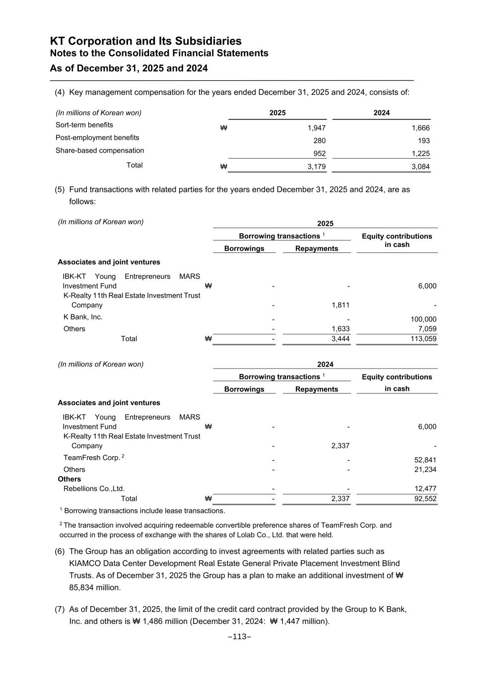 KT Corporation and Its Subsidiaries Notes to the Consolidated Financial Statements As of December 31, 2025 and 2024 (4) Key management compensation for the years ended December 31, 2025 and 2024, consists of: (In millions of Korean won) 2025 2024 Sort-term benefits ₩ 1,947 1,666 Post-employment benefits 280 193 Share-based compensation 952 1,225 Total ₩ 3,179 3,084 (5) Fund transactions with related parties for the years ended December 31, 2025 and 2024, are as follows: (In millions of Korean won) 2025 Borrowing transactions 1 Equity contributions in cash Borrowings Repayments Associates and joint ventures IBK-KT Young Entrepreneurs MARS Investment Fund ₩ - - 6,000 K-Realty 11th Real Estate Investment Trust Company - 1,811 - K Bank, Inc. - - 100,000 Others - 1,633 7,059 Total ₩ - 3,444 113,059 (In millions of Korean won) 2024 Borrowing transactions 1 Equity contributions in cash Borrowings Repayments Associates and joint ventures IBK-KT Young Entrepreneurs MARS Investment Fund ₩ - - 6,000 K-Realty 11th Real Estate Investment Trust Company - 2,337 - TeamFresh Corp. 2 - - 52,841 Others - - 21,234 Others Rebellions Co.,Ltd. - - 12,477 Total ₩ - 2,337 92,552 1 Borrowing transactions include lease transactions. 2 The transaction involved acquiring redeemable convertible preference shares of TeamFresh Corp. and occurred in the process of exchange with the shares of Lolab Co., Ltd. that were held. (6) The Group has an obligation according to invest agreements with related parties such as KIAMCO Data Center Development Real Estate General Private Placement Investment Blind Trusts. As of December 31, 2025 the Group has a plan to make an additional investment of ₩ 85,834 million. (7) As of December 31, 2025, the limit of the credit card contract provided by the Group to K Bank, Inc. and others is ₩ 1,486 million (December 31, 2024: ₩ 1,447 million). -113-