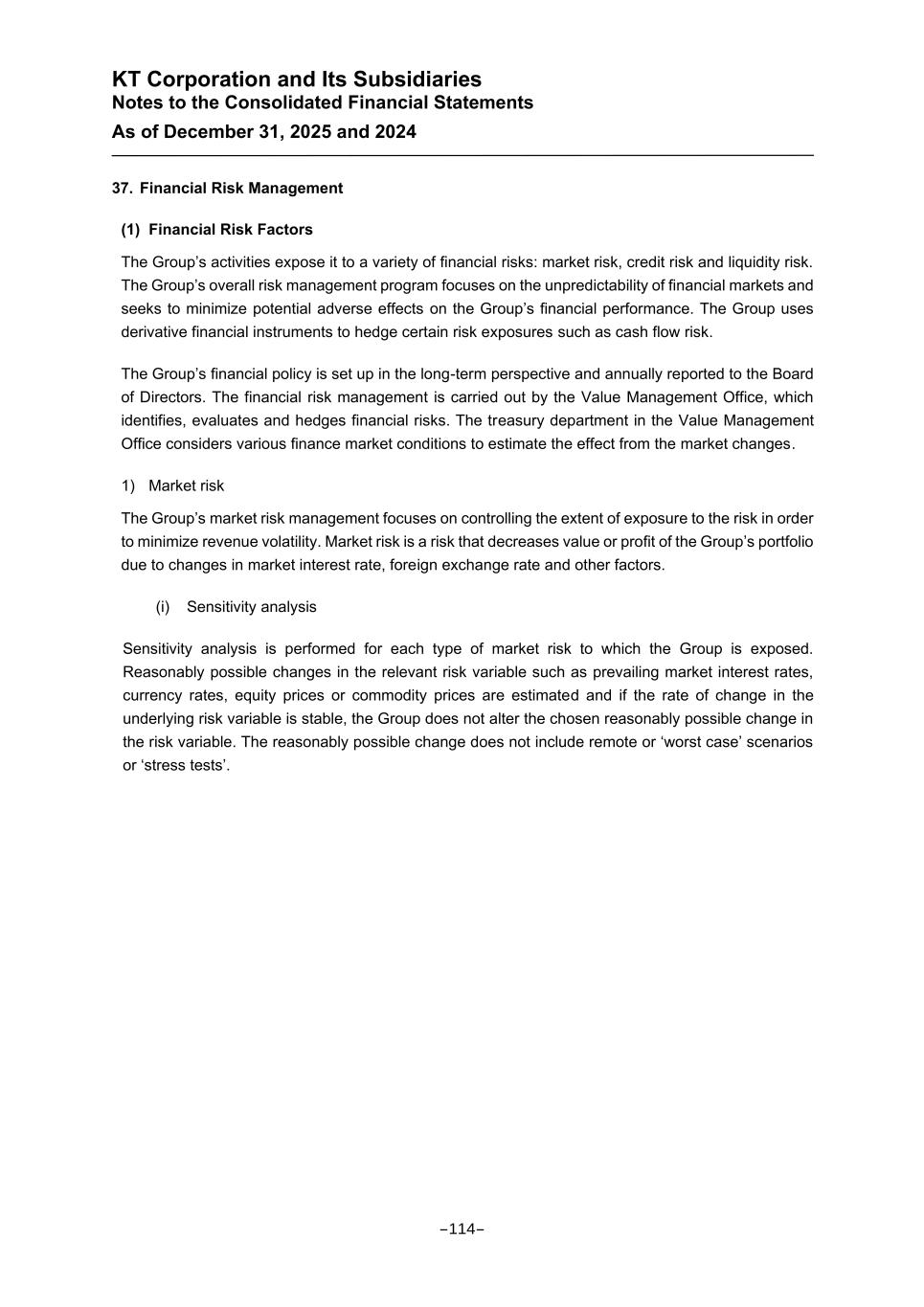 KT Corporation and Its Subsidiaries Notes to the Consolidated Financial Statements As of December 31, 2025 and 2024 37. Financial Risk Management (1) Financial Risk Factors The Group’s activities expose it to a variety of financial risks: market risk, credit risk and liquidity risk. The Group’s overall risk management program focuses on the unpredictability of financial markets and seeks to minimize potential adverse effects on the Group’s financial performance. The Group uses derivative financial instruments to hedge certain risk exposures such as cash flow risk. The Group’s financial policy is set up in the long-term perspective and annually reported to the Board of Directors. The financial risk management is carried out by the Value Management Office, which identifies, evaluates and hedges financial risks. The treasury department in the Value Management Office considers various finance market conditions to estimate the effect from the market changes. 1) Market risk The Group’s market risk management focuses on controlling the extent of exposure to the risk in order to minimize revenue volatility. Market risk is a risk that decreases value or profit of the Group’s portfolio due to changes in market interest rate, foreign exchange rate and other factors. (i) Sensitivity analysis Sensitivity analysis is performed for each type of market risk to which the Group is exposed. Reasonably possible changes in the relevant risk variable such as prevailing market interest rates, currency rates, equity prices or commodity prices are estimated and if the rate of change in the underlying risk variable is stable, the Group does not alter the chosen reasonably possible change in the risk variable. The reasonably possible change does not include remote or ‘worst case’ scenarios or ‘stress tests’. -114-