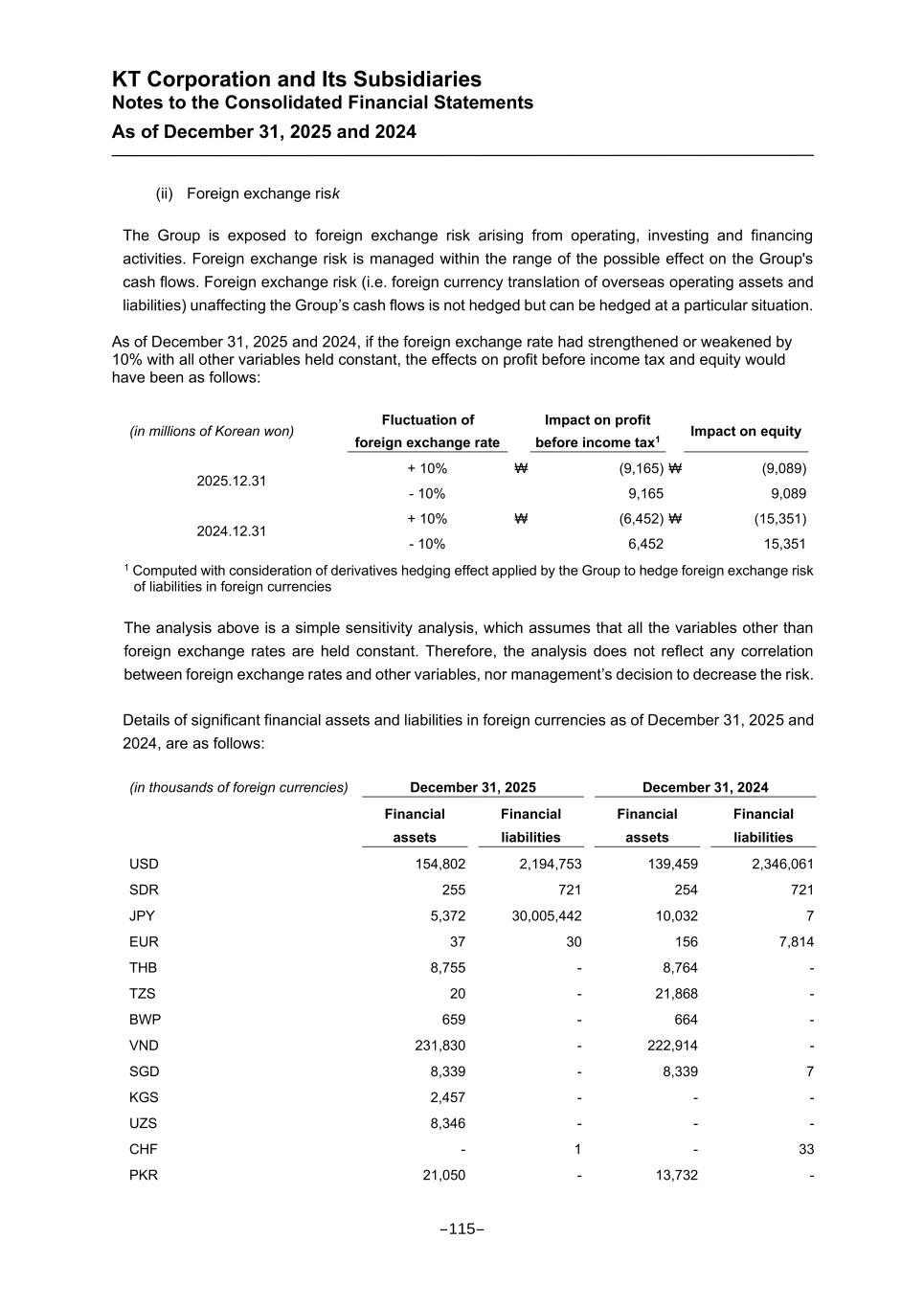 KT Corporation and Its Subsidiaries Notes to the Consolidated Financial Statements As of December 31, 2025 and 2024 (ii) Foreign exchange risk The Group is exposed to foreign exchange risk arising from operating, investing and financing activities. Foreign exchange risk is managed within the range of the possible effect on the Group's cash flows. Foreign exchange risk (i.e. foreign currency translation of overseas operating assets and liabilities) unaffecting the Group’s cash flows is not hedged but can be hedged at a particular situation. As of December 31, 2025 and 2024, if the foreign exchange rate had strengthened or weakened by 10% with all other variables held constant, the effects on profit before income tax and equity would have been as follows: (in millions of Korean won) Fluctuation of foreign exchange rate Impact on profit before income tax1 Impact on equity 2025.12.31 + 10% ₩ (9,165) ₩ (9,089) - 10% 9,165 9,089 2024.12.31 + 10% ₩ (6,452) ₩ (15,351) - 10% 6,452 15,351 1 Computed with consideration of derivatives hedging effect applied by the Group to hedge foreign exchange risk of liabilities in foreign currencies The analysis above is a simple sensitivity analysis, which assumes that all the variables other than foreign exchange rates are held constant. Therefore, the analysis does not reflect any correlation between foreign exchange rates and other variables, nor management’s decision to decrease the risk. Details of significant financial assets and liabilities in foreign currencies as of December 31, 2025 and 2024, are as follows: (in thousands of foreign currencies) December 31, 2025 December 31, 2024 Financial assets Financial liabilities Financial assets Financial liabilities USD 154,802 2,194,753 139,459 2,346,061 SDR 255 721 254 721 JPY 5,372 30,005,442 10,032 7 EUR 37 30 156 7,814 THB 8,755 - 8,764 - TZS 20 - 21,868 - BWP 659 - 664 - VND 231,830 - 222,914 - SGD 8,339 - 8,339 7 KGS 2,457 - - - UZS 8,346 - - - CHF - 1 - 33 PKR 21,050 - 13,732 - -115-