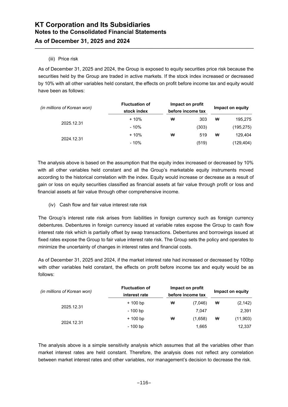 KT Corporation and Its Subsidiaries Notes to the Consolidated Financial Statements As of December 31, 2025 and 2024 (iii) Price risk As of December 31, 2025 and 2024, the Group is exposed to equity securities price risk because the securities held by the Group are traded in active markets. If the stock index increased or decreased by 10% with all other variables held constant, the effects on profit before income tax and equity would have been as follows: (in millions of Korean won) Fluctuation of stock index Impact on profit before income tax Impact on equity 2025.12.31 + 10% ₩ 303 ₩ 195,275 - 10% (303) (195,275) 2024.12.31 + 10% ₩ 519 ₩ 129,404 - 10% (519) (129,404) The analysis above is based on the assumption that the equity index increased or decreased by 10% with all other variables held constant and all the Group’s marketable equity instruments moved according to the historical correlation with the index. Equity would increase or decrease as a result of gain or loss on equity securities classified as financial assets at fair value through profit or loss and financial assets at fair value through other comprehensive income. (iv) Cash flow and fair value interest rate risk The Group’s interest rate risk arises from liabilities in foreign currency such as foreign currency debentures. Debentures in foreign currency issued at variable rates expose the Group to cash flow interest rate risk which is partially offset by swap transactions. Debentures and borrowings issued at fixed rates expose the Group to fair value interest rate risk. The Group sets the policy and operates to minimize the uncertainty of changes in interest rates and financial costs. As of December 31, 2025 and 2024, if the market interest rate had increased or decreased by 100bp with other variables held constant, the effects on profit before income tax and equity would be as follows: (in millions of Korean won) Fluctuation of interest rate Impact on profit before income tax Impact on equity 2025.12.31 + 100 bp ₩ (7,046) ₩ (2,142) - 100 bp 7,047 2,391 2024.12.31 + 100 bp ₩ (1,658) ₩ (11,903) - 100 bp 1,665 12,337 The analysis above is a simple sensitivity analysis which assumes that all the variables other than market interest rates are held constant. Therefore, the analysis does not reflect any correlation between market interest rates and other variables, nor management’s decision to decrease the risk. -116-