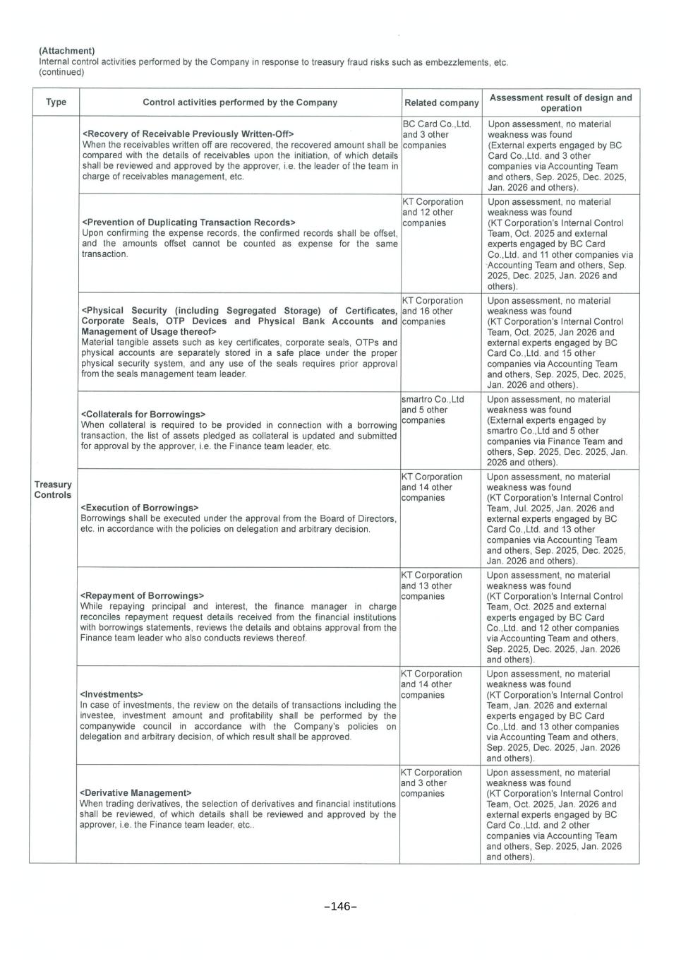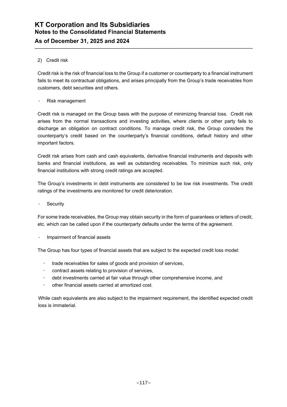 KT Corporation and Its Subsidiaries Notes to the Consolidated Financial Statements As of December 31, 2025 and 2024 2) Credit risk Credit risk is the risk of financial loss to the Group if a customer or counterparty to a financial instrument fails to meet its contractual obligations, and arises principally from the Group’s trade receivables from customers, debt securities and others. - Risk management Credit risk is managed on the Group basis with the purpose of minimizing financial loss. Credit risk arises from the normal transactions and investing activities, where clients or other party fails to discharge an obligation on contract conditions. To manage credit risk, the Group considers the counterparty’s credit based on the counterparty’s financial conditions, default history and other important factors. Credit risk arises from cash and cash equivalents, derivative financial instruments and deposits with banks and financial institutions, as well as outstanding receivables. To minimize such risk, only financial institutions with strong credit ratings are accepted. The Group’s investments in debt instruments are considered to be low risk investments. The credit ratings of the investments are monitored for credit deterioration. - Security For some trade receivables, the Group may obtain security in the form of guarantees or letters of credit, etc. which can be called upon if the counterparty defaults under the terms of the agreement. - Impairment of financial assets The Group has four types of financial assets that are subject to the expected credit loss model: trade receivables for sales of goods and provision of services, contract assets relating to provision of services, debt investments carried at fair value through other comprehensive income, and other financial assets carried at amortized cost. While cash equivalents are also subject to the impairment requirement, the identified expected credit loss is immaterial. -117-