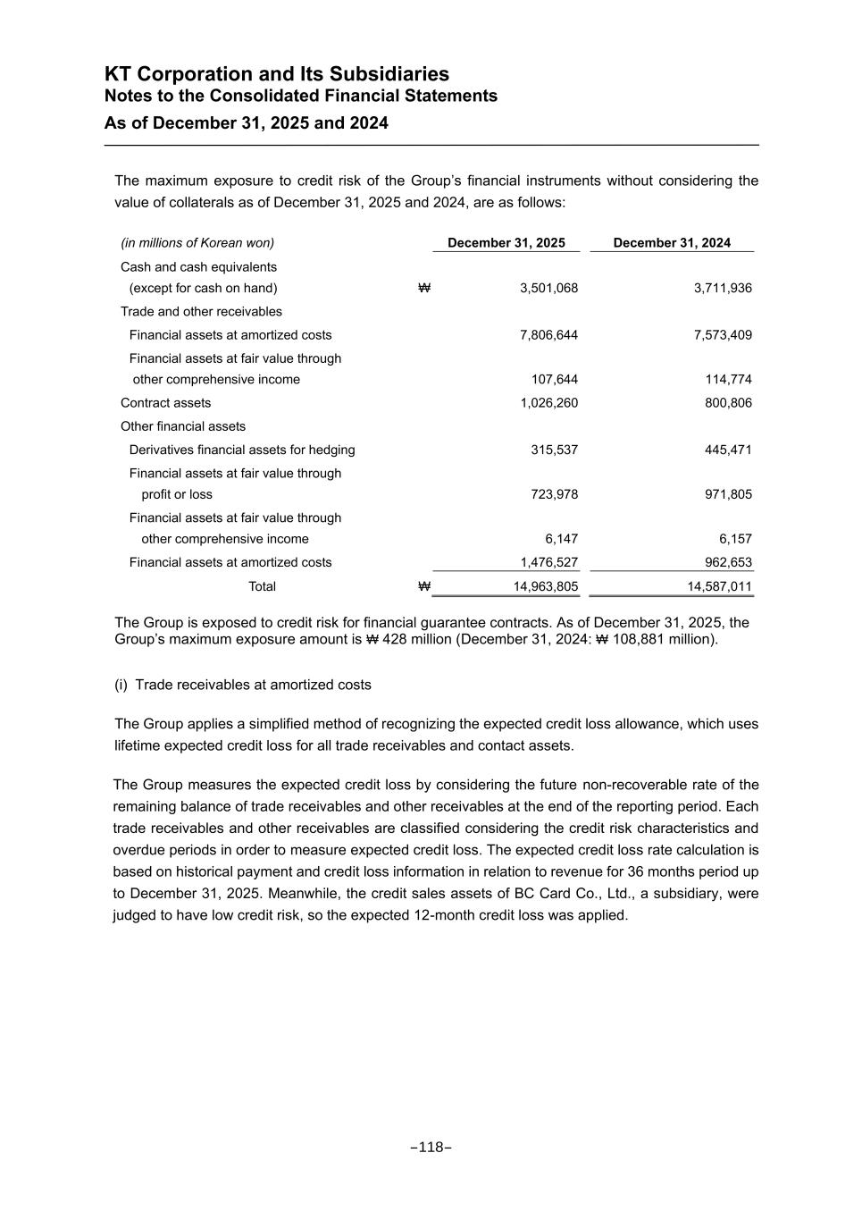 KT Corporation and Its Subsidiaries Notes to the Consolidated Financial Statements As of December 31, 2025 and 2024 The maximum exposure to credit risk of the Group’s financial instruments without considering the value of collaterals as of December 31, 2025 and 2024, are as follows: (in millions of Korean won) December 31, 2025 December 31, 2024 Cash and cash equivalents (except for cash on hand) ₩ 3,501,068 3,711,936 Trade and other receivables Financial assets at amortized costs 7,806,644 7,573,409 Financial assets at fair value through other comprehensive income 107,644 114,774 Contract assets 1,026,260 800,806 Other financial assets Derivatives financial assets for hedging 315,537 445,471 Financial assets at fair value through profit or loss 723,978 971,805 Financial assets at fair value through other comprehensive income 6,147 6,157 Financial assets at amortized costs 1,476,527 962,653 Total ₩ 14,963,805 14,587,011 The Group is exposed to credit risk for financial guarantee contracts. As of December 31, 2025, the Group’s maximum exposure amount is ₩ 428 million (December 31, 2024: ₩ 108,881 million). (i) Trade receivables at amortized costs The Group applies a simplified method of recognizing the expected credit loss allowance, which uses lifetime expected credit loss for all trade receivables and contact assets. The Group measures the expected credit loss by considering the future non-recoverable rate of the remaining balance of trade receivables and other receivables at the end of the reporting period. Each trade receivables and other receivables are classified considering the credit risk characteristics and overdue periods in order to measure expected credit loss. The expected credit loss rate calculation is based on historical payment and credit loss information in relation to revenue for 36 months period up to December 31, 2025. Meanwhile, the credit sales assets of BC Card Co., Ltd., a subsidiary, were judged to have low credit risk, so the expected 12-month credit loss was applied. -118-