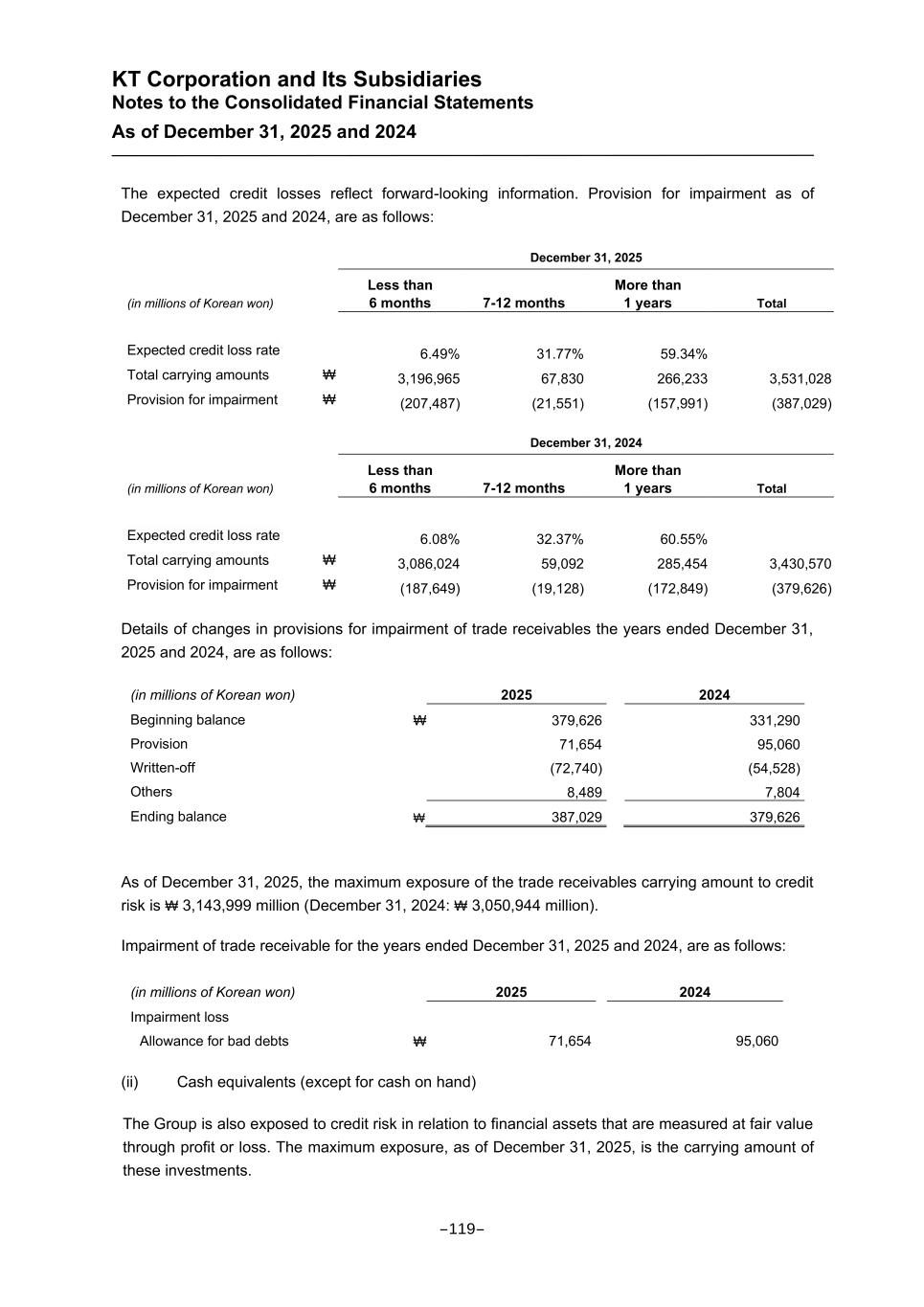 KT Corporation and Its Subsidiaries Notes to the Consolidated Financial Statements As of December 31, 2025 and 2024 The expected credit losses reflect forward-looking information. Provision for impairment as of December 31, 2025 and 2024, are as follows: December 31, 2025 (in millions of Korean won) Less than 6 months 7-12 months More than 1 years Total Expected credit loss rate 6.49% 31.77% 59.34% Total carrying amounts ₩ 3,196,965 67,830 266,233 3,531,028 Provision for impairment ₩ (207,487) (21,551) (157,991) (387,029) December 31, 2024 (in millions of Korean won) Less than 6 months 7-12 months More than 1 years Total Expected credit loss rate 6.08% 32.37% 60.55% Total carrying amounts ₩ 3,086,024 59,092 285,454 3,430,570 Provision for impairment ₩ (187,649) (19,128) (172,849) (379,626) Details of changes in provisions for impairment of trade receivables the years ended December 31, 2025 and 2024, are as follows: (in millions of Korean won) 2025 2024 Beginning balance ₩ 379,626 331,290 Provision 71,654 95,060 Written-off (72,740) (54,528) Others 8,489 7,804 Ending balance ₩ 387,029 379,626 As of December 31, 2025, the maximum exposure of the trade receivables carrying amount to credit risk is ₩ 3,143,999 million (December 31, 2024: ₩ 3,050,944 million). Impairment of trade receivable for the years ended December 31, 2025 and 2024, are as follows: (in millions of Korean won) 2025 2024 Impairment loss Allowance for bad debts ₩ 71,654 95,060 (ii) Cash equivalents (except for cash on hand) The Group is also exposed to credit risk in relation to financial assets that are measured at fair value through profit or loss. The maximum exposure, as of December 31, 2025, is the carrying amount of these investments. -119-