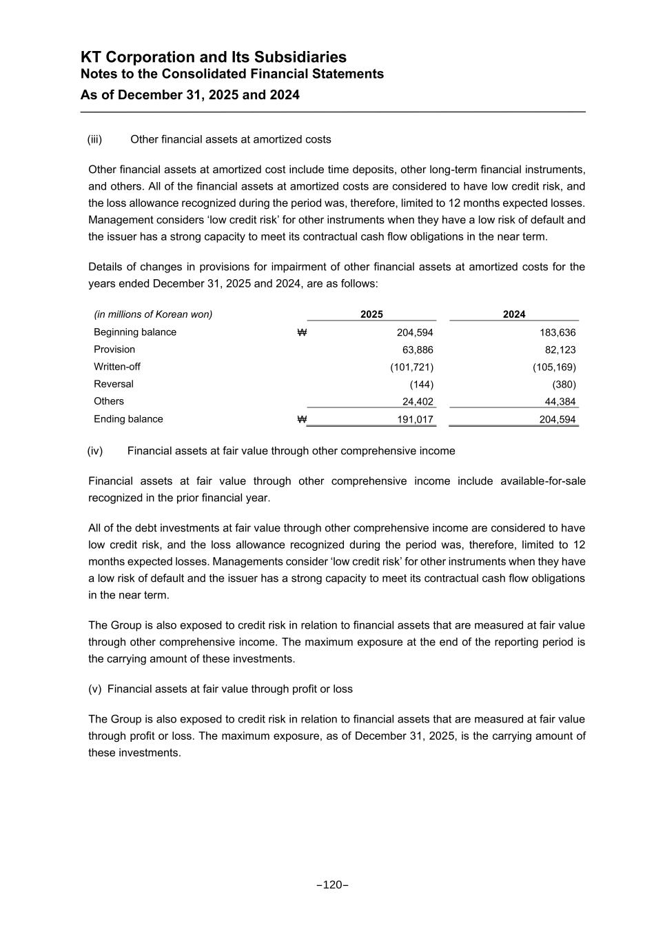 KT Corporation and Its Subsidiaries Notes to the Consolidated Financial Statements As of December 31, 2025 and 2024 (iii) Other financial assets at amortized costs Other financial assets at amortized cost include time deposits, other long-term financial instruments, and others. All of the financial assets at amortized costs are considered to have low credit risk, and the loss allowance recognized during the period was, therefore, limited to 12 months expected losses. Management considers ‘low credit risk’ for other instruments when they have a low risk of default and the issuer has a strong capacity to meet its contractual cash flow obligations in the near term. Details of changes in provisions for impairment of other financial assets at amortized costs for the years ended December 31, 2025 and 2024, are as follows: (in millions of Korean won) 2025 2024 Beginning balance ₩ 204,594 183,636 Provision 63,886 82,123 Written-off (101,721) (105,169) Reversal (144) (380) Others 24,402 44,384 Ending balance ₩ 191,017 204,594 (iv) Financial assets at fair value through other comprehensive income Financial assets at fair value through other comprehensive income include available-for-sale recognized in the prior financial year. All of the debt investments at fair value through other comprehensive income are considered to have low credit risk, and the loss allowance recognized during the period was, therefore, limited to 12 months expected losses. Managements consider ‘low credit risk’ for other instruments when they have a low risk of default and the issuer has a strong capacity to meet its contractual cash flow obligations in the near term. The Group is also exposed to credit risk in relation to financial assets that are measured at fair value through other comprehensive income. The maximum exposure at the end of the reporting period is the carrying amount of these investments. (v) Financial assets at fair value through profit or loss The Group is also exposed to credit risk in relation to financial assets that are measured at fair value through profit or loss. The maximum exposure, as of December 31, 2025, is the carrying amount of these investments. -120-