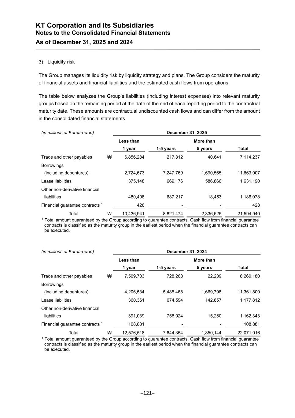 KT Corporation and Its Subsidiaries Notes to the Consolidated Financial Statements As of December 31, 2025 and 2024 3) Liquidity risk The Group manages its liquidity risk by liquidity strategy and plans. The Group considers the maturity of financial assets and financial liabilities and the estimated cash flows from operations. The table below analyzes the Group’s liabilities (including interest expenses) into relevant maturity groups based on the remaining period at the date of the end of each reporting period to the contractual maturity date. These amounts are contractual undiscounted cash flows and can differ from the amount in the consolidated financial statements. (in millions of Korean won) December 31, 2025 Less than 1 year 1-5 years More than 5 years Total Trade and other payables ₩ 6,856,284 217,312 40,641 7,114,237 Borrowings (including debentures) 2,724,673 7,247,769 1,690,565 11,663,007 Lease liabilities 375,148 669,176 586,866 1,631,190 Other non-derivative financial liabilities 480,408 687,217 18,453 1,186,078 Financial guarantee contracts 1 428 - - 428 Total ₩ 10,436,941 8,821,474 2,336,525 21,594,940 1 Total amount guaranteed by the Group according to guarantee contracts. Cash flow from financial guarantee contracts is classified as the maturity group in the earliest period when the financial guarantee contracts can be executed. (in millions of Korean won) December 31, 2024 Less than 1 year 1-5 years More than 5 years Total Trade and other payables ₩ 7,509,703 728,268 22,209 8,260,180 Borrowings (including debentures) 4,206,534 5,485,468 1,669,798 11,361,800 Lease liabilities 360,361 674,594 142,857 1,177,812 Other non-derivative financial liabilities 391,039 756,024 15,280 1,162,343 Financial guarantee contracts 1 108,881 - - 108,881 Total ₩ 12,576,518 7,644,354 1,850,144 22,071,016 1 Total amount guaranteed by the Group according to guarantee contracts. Cash flow from financial guarantee contracts is classified as the maturity group in the earliest period when the financial guarantee contracts can be executed. -121-