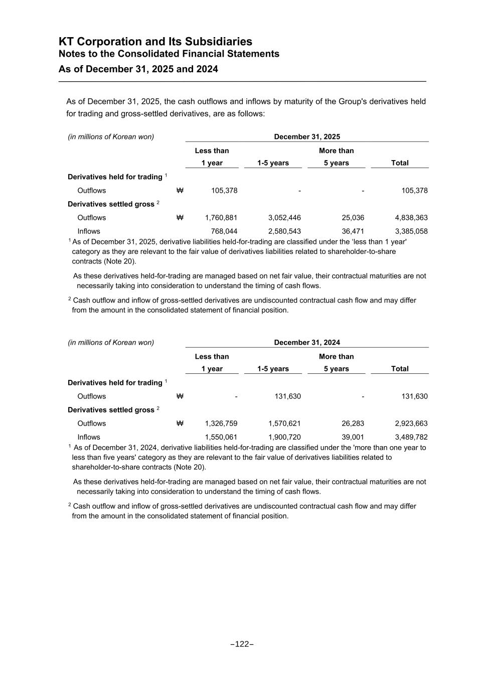 KT Corporation and Its Subsidiaries Notes to the Consolidated Financial Statements As of December 31, 2025 and 2024 As of December 31, 2025, the cash outflows and inflows by maturity of the Group's derivatives held for trading and gross-settled derivatives, are as follows: (in millions of Korean won) December 31, 2025 Less than 1 year 1-5 years More than 5 years Total Derivatives held for trading 1 Outflows ₩ 105,378 - - 105,378 Derivatives settled gross 2 Outflows ₩ 1,760,881 3,052,446 25,036 4,838,363 Inflows 768,044 2,580,543 36,471 3,385,058 1 As of December 31, 2025, derivative liabilities held-for-trading are classified under the ‘less than 1 year' category as they are relevant to the fair value of derivatives liabilities related to shareholder-to-share contracts (Note 20). As these derivatives held-for-trading are managed based on net fair value, their contractual maturities are not necessarily taking into consideration to understand the timing of cash flows. 2 Cash outflow and inflow of gross-settled derivatives are undiscounted contractual cash flow and may differ from the amount in the consolidated statement of financial position. (in millions of Korean won) December 31, 2024 Less than 1 year 1-5 years More than 5 years Total Derivatives held for trading 1 Outflows ₩ - 131,630 - 131,630 Derivatives settled gross 2 Outflows ₩ 1,326,759 1,570,621 26,283 2,923,663 Inflows 1,550,061 1,900,720 39,001 3,489,782 1 As of December 31, 2024, derivative liabilities held-for-trading are classified under the 'more than one year to less than five years' category as they are relevant to the fair value of derivatives liabilities related to shareholder-to-share contracts (Note 20). As these derivatives held-for-trading are managed based on net fair value, their contractual maturities are not necessarily taking into consideration to understand the timing of cash flows. 2 Cash outflow and inflow of gross-settled derivatives are undiscounted contractual cash flow and may differ from the amount in the consolidated statement of financial position. -122-