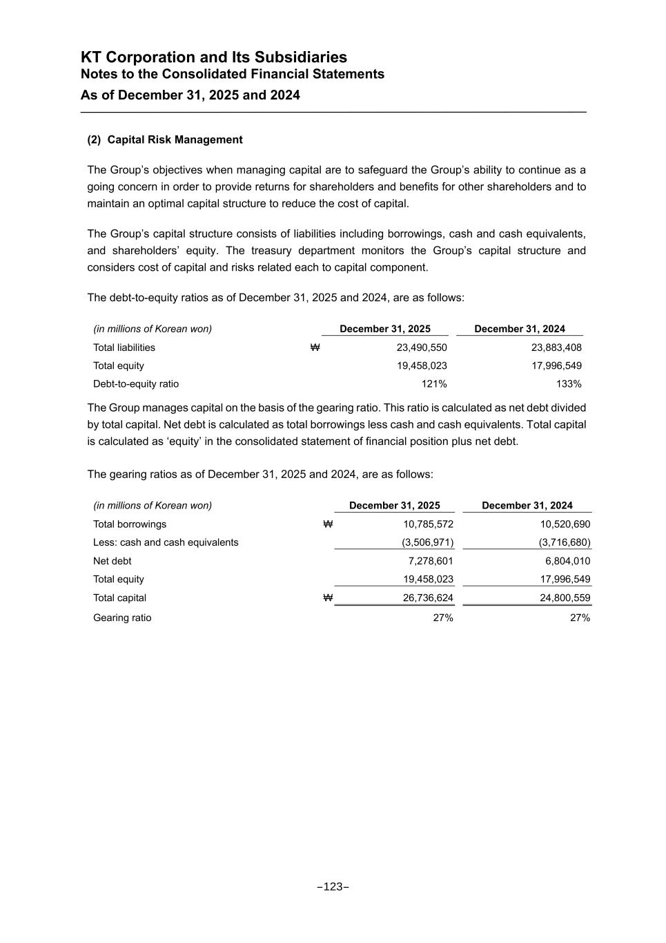 KT Corporation and Its Subsidiaries Notes to the Consolidated Financial Statements As of December 31, 2025 and 2024 (2) Capital Risk Management The Group’s objectives when managing capital are to safeguard the Group’s ability to continue as a going concern in order to provide returns for shareholders and benefits for other shareholders and to maintain an optimal capital structure to reduce the cost of capital. The Group’s capital structure consists of liabilities including borrowings, cash and cash equivalents, and shareholders’ equity. The treasury department monitors the Group’s capital structure and considers cost of capital and risks related each to capital component. The debt-to-equity ratios as of December 31, 2025 and 2024, are as follows: (in millions of Korean won) December 31, 2025 December 31, 2024 Total liabilities ₩ 23,490,550 23,883,408 Total equity 19,458,023 17,996,549 Debt-to-equity ratio 121% 133% The Group manages capital on the basis of the gearing ratio. This ratio is calculated as net debt divided by total capital. Net debt is calculated as total borrowings less cash and cash equivalents. Total capital is calculated as ‘equity’ in the consolidated statement of financial position plus net debt. The gearing ratios as of December 31, 2025 and 2024, are as follows: (in millions of Korean won) December 31, 2025 December 31, 2024 Total borrowings ₩ 10,785,572 10,520,690 Less: cash and cash equivalents (3,506,971) (3,716,680) Net debt 7,278,601 6,804,010 Total equity 19,458,023 17,996,549 Total capital ₩ 26,736,624 24,800,559 Gearing ratio 27% 27% -123-