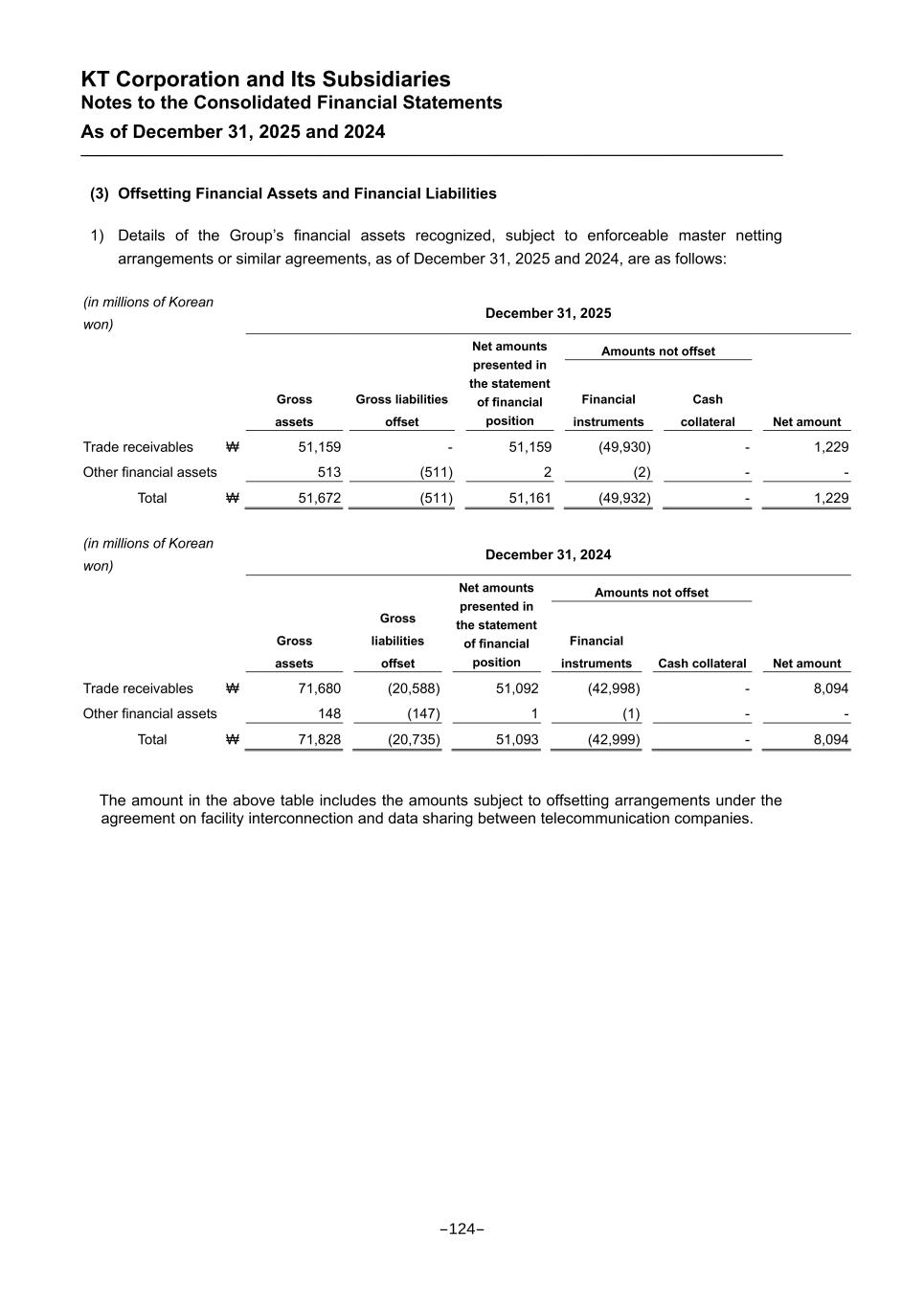 KT Corporation and Its Subsidiaries Notes to the Consolidated Financial Statements As of December 31, 2025 and 2024 (3) Offsetting Financial Assets and Financial Liabilities 1) Details of the Group’s financial assets recognized, subject to enforceable master netting arrangements or similar agreements, as of December 31, 2025 and 2024, are as follows: (in millions of Korean won) December 31, 2025 Gross assets Gross liabilities offset Net amounts presented in the statement of financial position Amounts not offset Net amount Financial instruments Cash collateral Trade receivables ₩ 51,159 - 51,159 (49,930) - 1,229 Other financial assets 513 (511) 2 (2) - - Total ₩ 51,672 (511) 51,161 (49,932) - 1,229 (in millions of Korean won) December 31, 2024 Gross assets Gross liabilities offset Net amounts presented in the statement of financial position Amounts not offset Net amount Financial instruments Cash collateral Trade receivables ₩ 71,680 (20,588) 51,092 (42,998) - 8,094 Other financial assets 148 (147) 1 (1) - - Total ₩ 71,828 (20,735) 51,093 (42,999) - 8,094 The amount in the above table includes the amounts subject to offsetting arrangements under the agreement on facility interconnection and data sharing between telecommunication companies. -124-